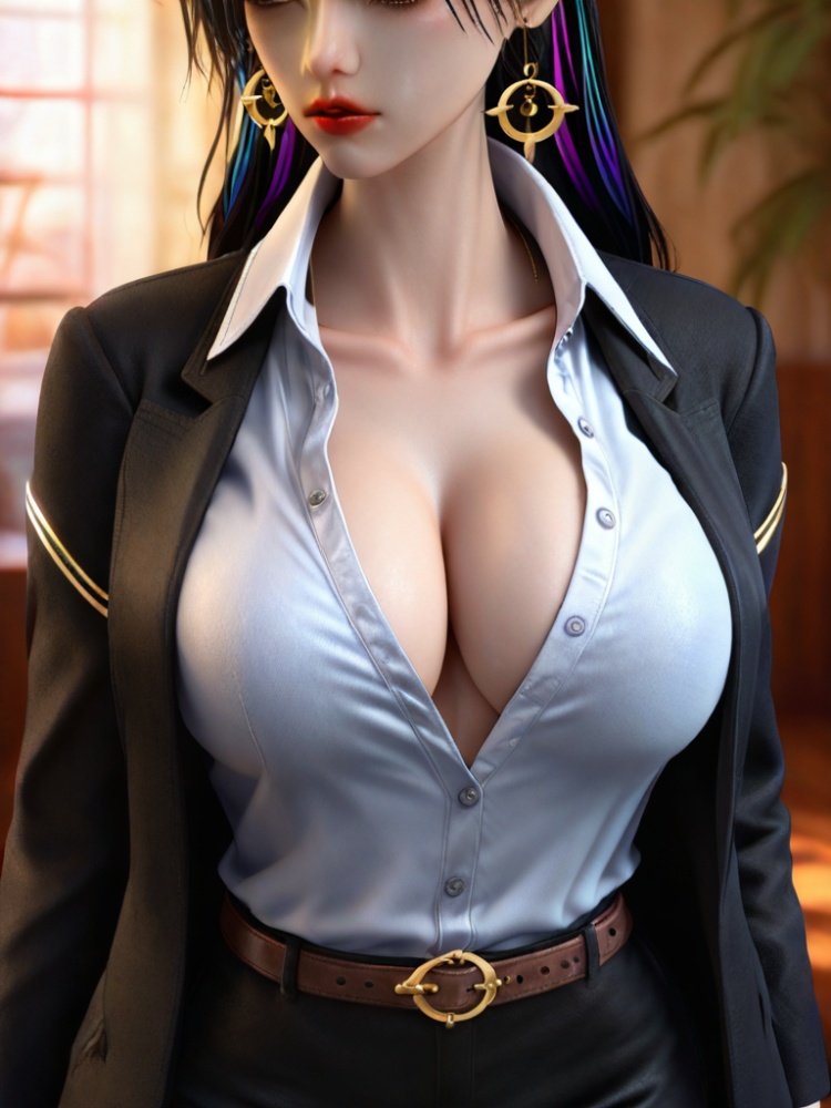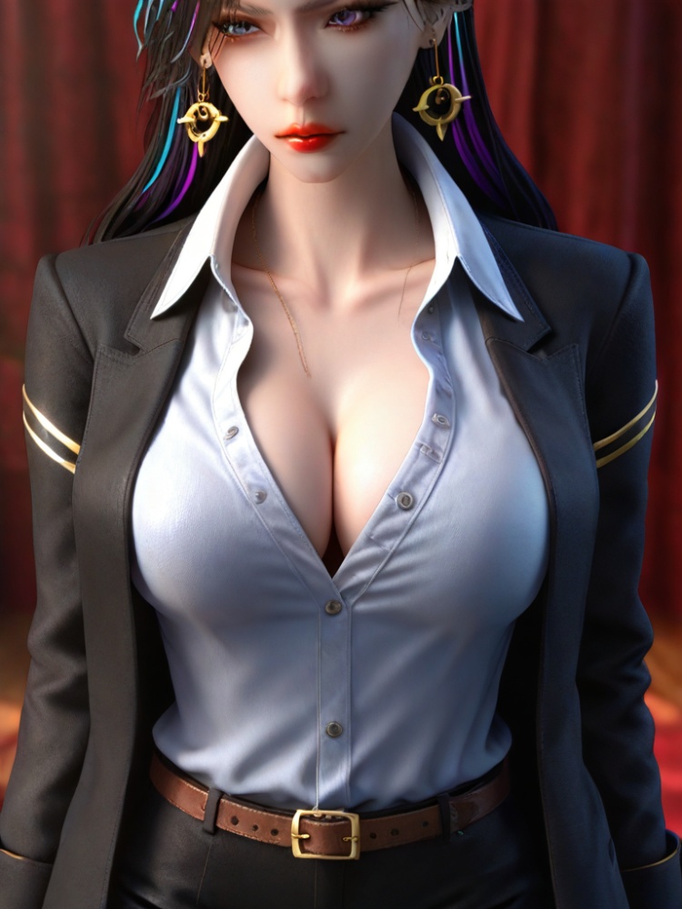 3D,1girl,office lady,multicolored hair,eyelashes,suit,partially unbuttoned,dress shirt,purple eyes,lipstick,open clothes,black pantyhose,coat,belt,red lips,black pants,collarbone,cleavage,large breasts,collared shirt streaked hair,portrait,realistic,black hair,blue eyes,jewelry,