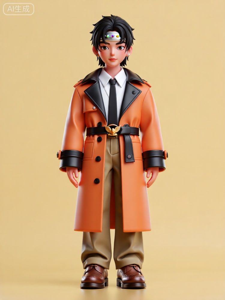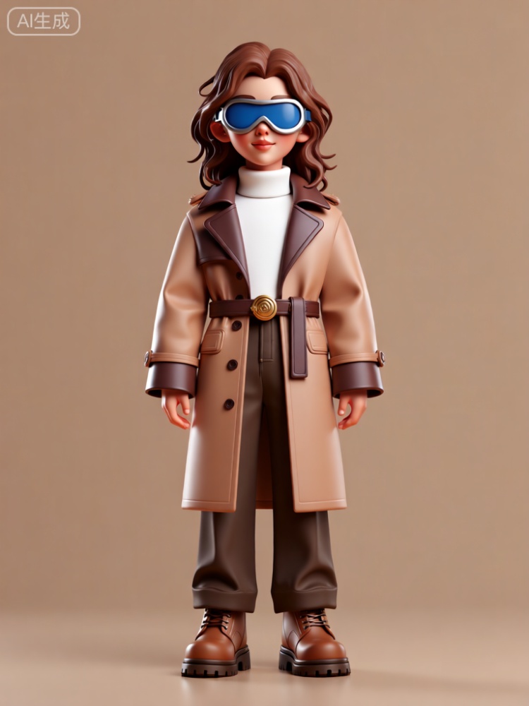 CWIP,这是一个风格化、3D 渲染的人物雕像的图像。该角色外表年轻,留着黑色尖刺短发。他们头上戴着一副圆形的绿色护目镜。该角色的服装包括一件奶油色垂直条纹夹克,翻领、袖口上有亮绿色点缀,胸前有一个小补丁。在夹克下面,他们穿了一件黑色衬衫。这件夹克用一条黑色腰带系紧,腰带上有一个圆形绿色带扣,上面写着“SWAT”字样。该角色还穿着宽松的黑色裤子,表面有光泽。裤子上靠近口袋的地方有小的、长方形的、深色的标签。该角色的鞋子是一双厚实的黑色鞋子,脚踝周围有绿色点缀。背景是简单的浅灰色,确保人物是图像的主要焦点。