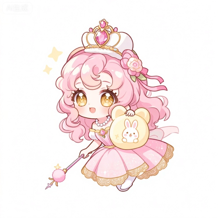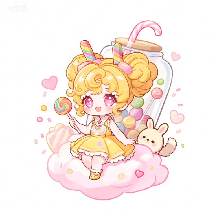 KTXR, 该图像描绘了一个糖果王国风格的小女甜心角色,亮黄色的头发卷成两个蓬松的大发髻,每个发髻上都插着一根彩色的棒棒糖。她有一双如同糖果般甜蜜的粉色大眼睛,眼中闪烁着灵动的光芒,穿着一件带有彩色糖果图案、领口和裙摆镶着白色花边的亮黄色连衣裙。她正开心地坐在一个巨大的粉色棉花糖云朵上,手里拿着一根长长的彩虹糖棒。她的身后是一个巨大的透明玻璃罐,里面装满了五颜六色的糖果,一根弯曲的吸管从罐子中伸出来。周围漂浮着几颗圆滚滚的糖果,一只圆脸圆身、有着短耳朵和毛茸茸尾巴,像小兔子一样的小生物从玻璃罐后面偷偷地探出头来。背景是纯白的,粉色的小爱心和闪烁的糖粒散布在各处,营造出可爱又甜蜜梦幻的氛围。