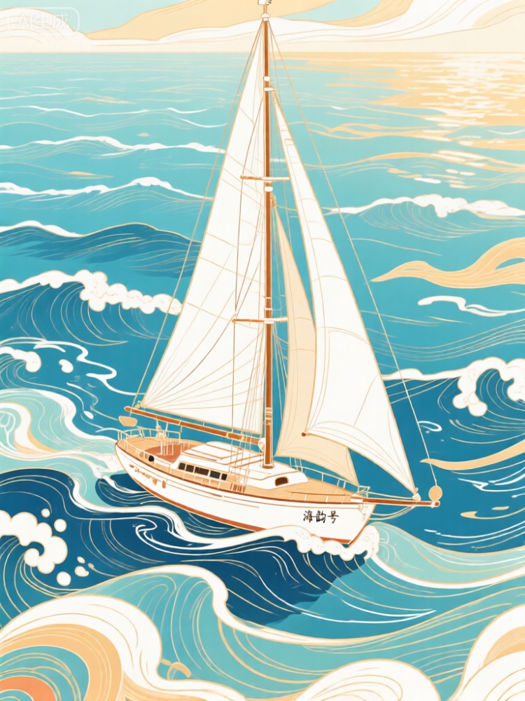 GCCH,该图像是一艘优雅灵动、充满艺术气息的帆船插图。这艘帆船是一款精致的白色“海韵号”,具有高耸的桅杆和随风飘扬的巨大船帆。背景是波澜壮阔的大海,颜色丰富而多变,包括深邃的蓝色、清新的浅蓝、洁白的浪花色和温暖的金色(阳光洒在海面),营造出自由且惬意的氛围。船下是涌动的海浪,以灵动的曲线描绘,增强了帆船在海上航行的动态感。整体风格清新自然,线条柔和且富有韵律,色彩明亮而和谐,给人一种自由、惬意且充满活力的感觉。