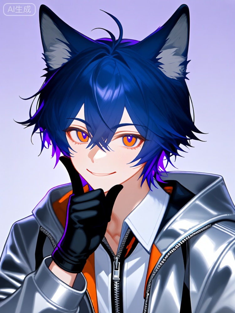 WHT,这张图片描绘了一个动漫风格的男性角色,有着深邃的靛蓝色头发和类似于狼或犬的大而尖的耳朵,每只耳朵都有一个浅灰色的内部部分。该角色有一双富有魅力的橙色大眼睛,瞳孔周围带有一丝紫色,使它们看起来神秘莫测。头发在头顶设计成几缕竖起的造型,一些发丝凌乱地垂在额前。角色的表情带着一丝玩味,嘴角微微上扬,一只手托着下巴,拇指向上。他们穿着酷炫的银灰色金属质感外套,前面有拉链,能够反射光线,使其看起来科技感十足。在外套下面,可以看到一件白色衬衫,领口附近有橙色和黑色的细节。该角色托着下巴的手上还戴着黑色指套。背景是简单的淡紫色渐变,将焦点集中在角色上。整体风格细致且富有创意,注重鲜明的色彩和独特的表现力。