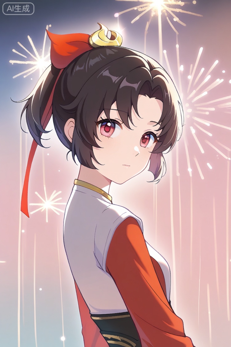 black short hair,short ponytail,hair ribbon with gold ornament,