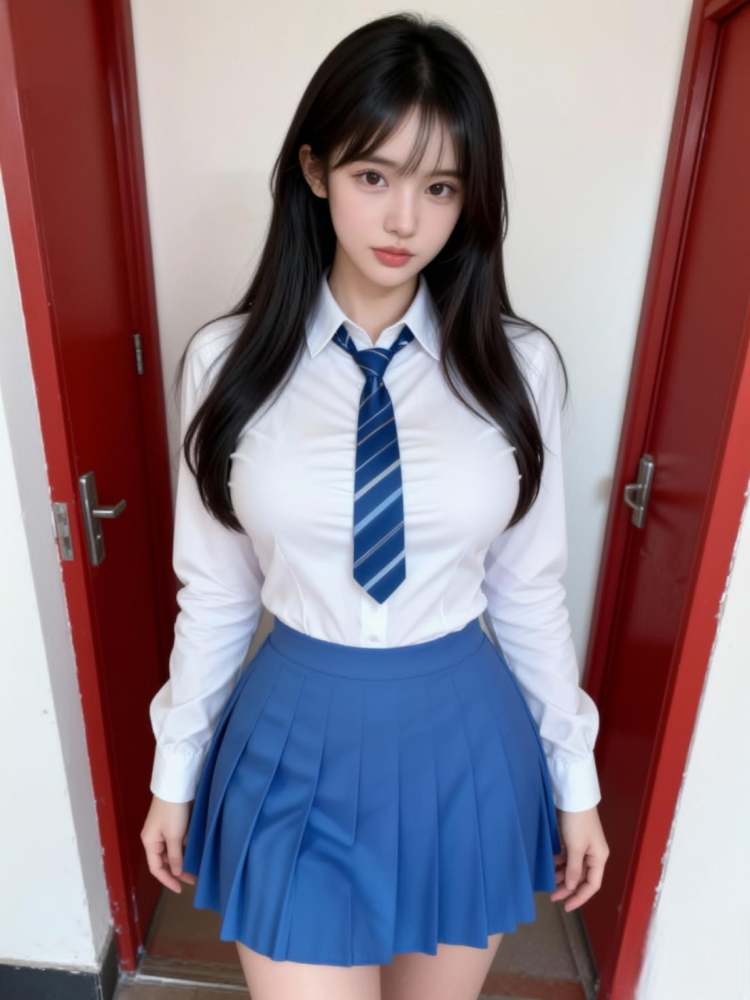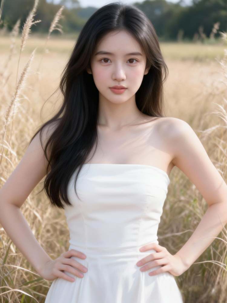 a photo-realistic portrait shoot from a portrait camera angle about a young woman with long black hair, wearing a white ribbed turtleneck sweater, the image also shows a soft, warm light illuminating her face and upper body, on the middle of the image, a 20-year-old woman appears to be looking directly at the viewer with a neutral expression, she has long, straight black hair that falls down her back, and her eyes are a striking brown color, her hair is styled in a neat, straight manner, and she is wearing a tight, ribbed white sweater that accentuates her large breasts, her body is slim and she has bare shoulders, the background is a simple, neutral-colored wall with a brown leather couch in the foreground, the lighting is soft and diffused, creating a warm and inviting atmosphere,