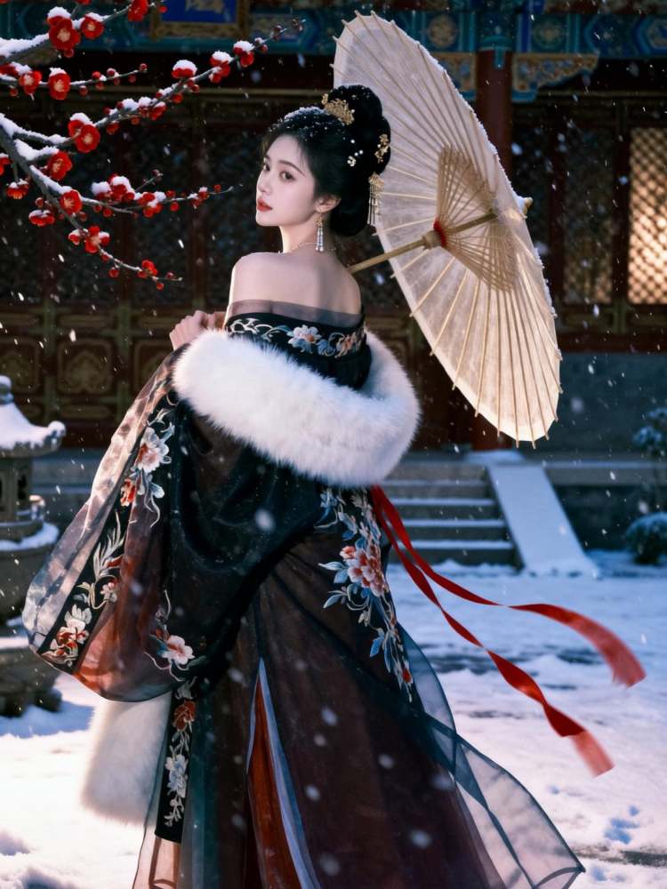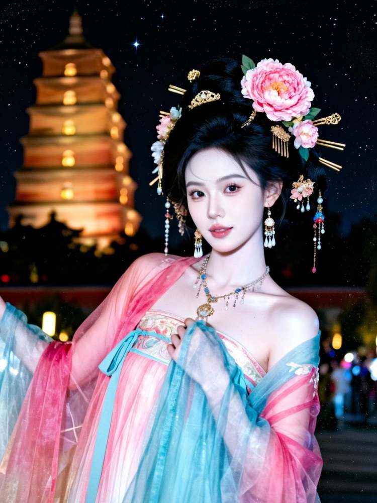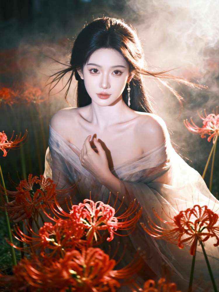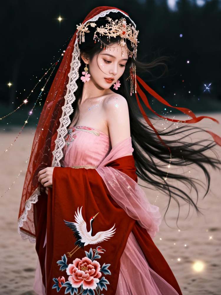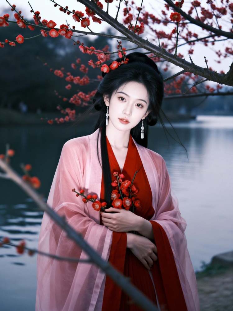 this is a photograph of an east asian woman with long, straight black hair, wearing a sheer, off-the-shoulder red chiffon dress with a red ribbon tied around her neck, she has fair skin, delicate features, and is wearing metallic, dangling earrings, her lips are painted a subtle red, matching her dress, she is surrounded by pink cherry blossom branches in full bloom, with soft light illuminating her face from the right, the background is dark, making the cherry blossoms and her figure stand out, her expression is serene, and she is gently touching her hair with her right hand, the overall mood is ethereal and romantic