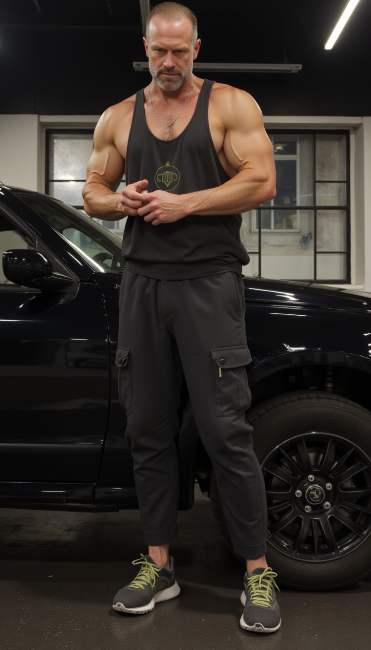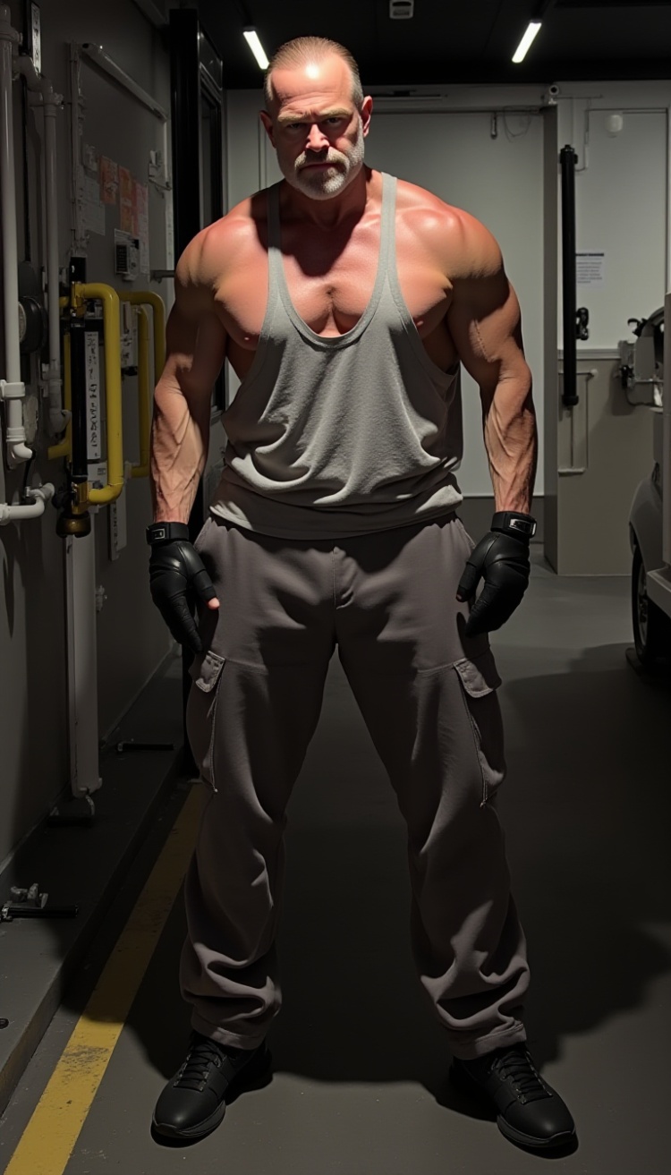 F1EUJulianBelly, Photograph of a muscular, bald, older white man with a gray beard standing in a modern gym. He is wearing a dark blue sleeveless **** top with orange and white geometric designs, and dark green workout pants. His broad, defined arms are prominently displayed as he holds a black smartphone in front of him, looking at the screen with a focused expression. The gym has gray floors, red walls, and various exercise equipment in the background, including a weight machine on the left and a bench on the right. The lighting is bright and fluorescent, highlighting the man's muscular physique.