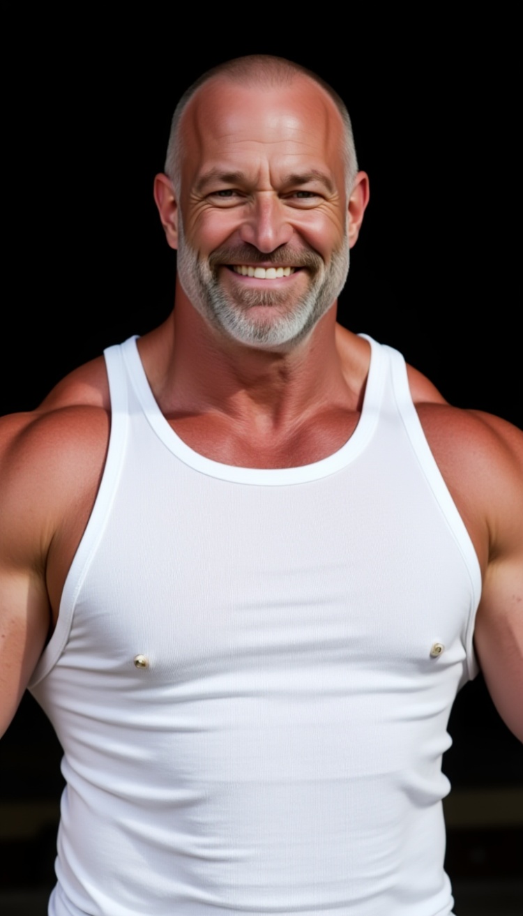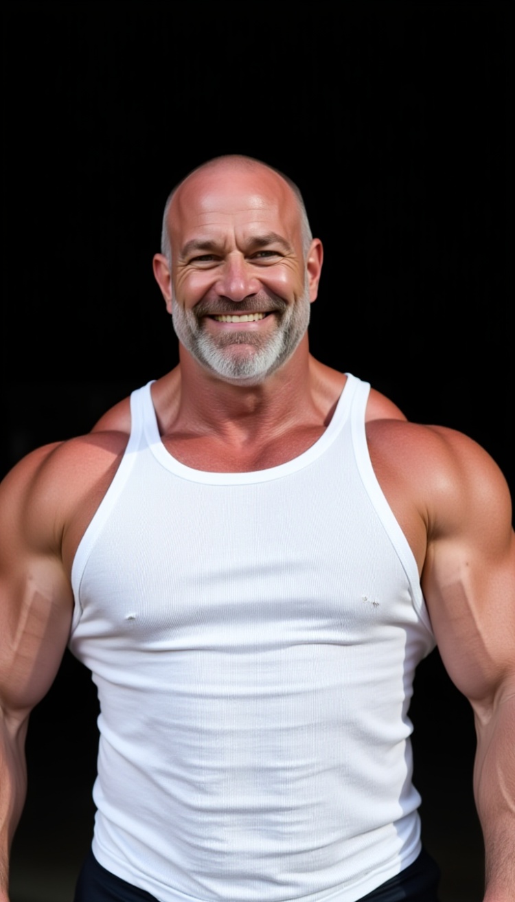 F1EUJulianBelly, Photograph of a muscular, middle-aged Caucasian man with a bald head and a short, gray beard. He has a broad, smiling face and is wearing a tight, white ribbed **** top that highlights his well-defined biceps and chest. The background is dark, making the man's white **** top and light skin stand out prominently. His skin has a slight tan, and his muscular build is evident. The image is sharply focused on his upper body, with the dark background providing a stark contrast to his light clothing and skin. The overall lighting is even, emphasizing his physique and facial expression.