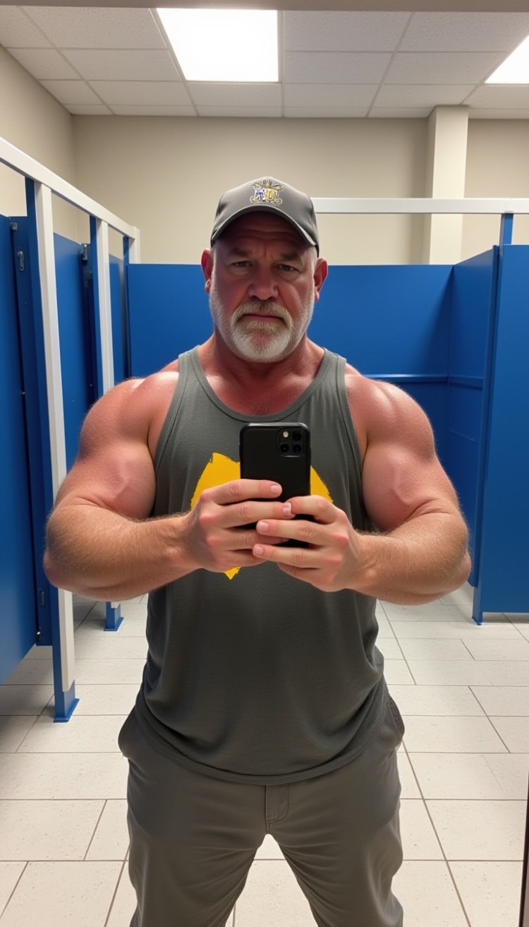 F1EUJulianBelly, Photograph of a middle-aged, muscular white man with a full gray beard and mustache, wearing a gray baseball cap, sleeveless gray **** top with a yellow graphic, and gray pants. He is standing in a brightly lit public restroom with blue stall dividers in the background. He is holding a black smartphone with both hands, taking a mirror selfie. His arms are prominently displayed, showcasing his muscular build. The restroom has white tiled floors and a drop ceiling with fluorescent lights. The man's expression is neutral, and his skin is fair with some visible hair on his arms.