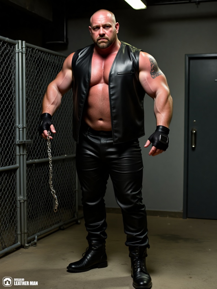 F1EUJulianBelly, Photograph of a muscular, bald man with a trimmed beard standing against a worn, gray, textured wall. He is wearing black leather harness with straps across his chest, black leather pants, and black leather boots. His right hand holds a black leather whip with a metal handle, while his left hand rests by his side. The man has a fair skin tone, defined muscles, and a serious expression. The lighting highlights his muscular physique and the sheen of the leather. The background has patches of peeling paint, adding a gritty, industrial feel to the image. The overall style is provocative and edgy.