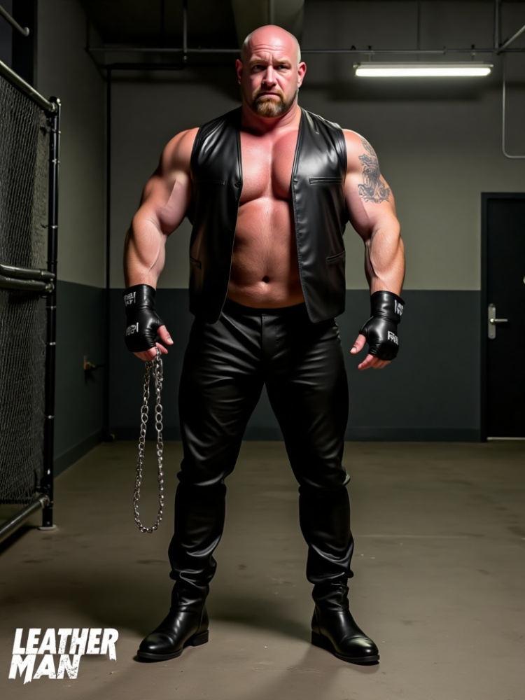 F1EUJulianBelly, Photograph of a muscular, bald, middle-aged man with a goatee, standing against a plain dark gray background. He has a fair skin tone and is shirtless, showcasing his broad, defined chest and arms. He wears black leather pants with suspenders and black boots. In his right hand, he holds a riding crop with a wooden handle and black leather strap. His facial expression is serious and intense. The lighting is even, highlighting his muscular physique and the sheen of the leather. The overall style is bold and provocative, with a focus on his dominant, commanding presence.