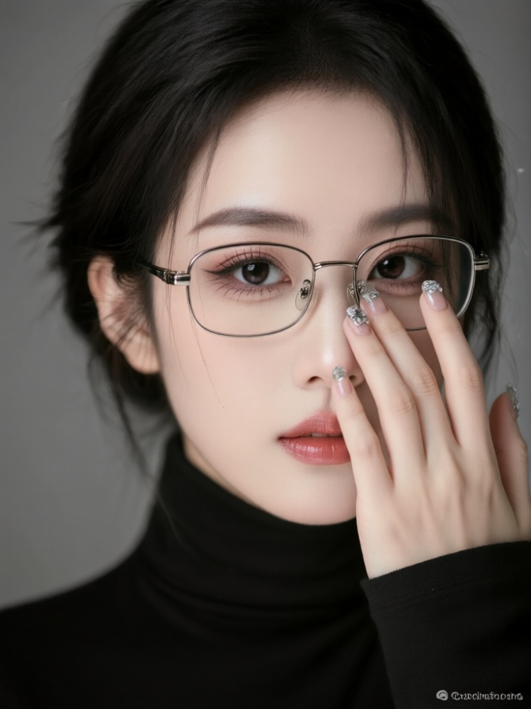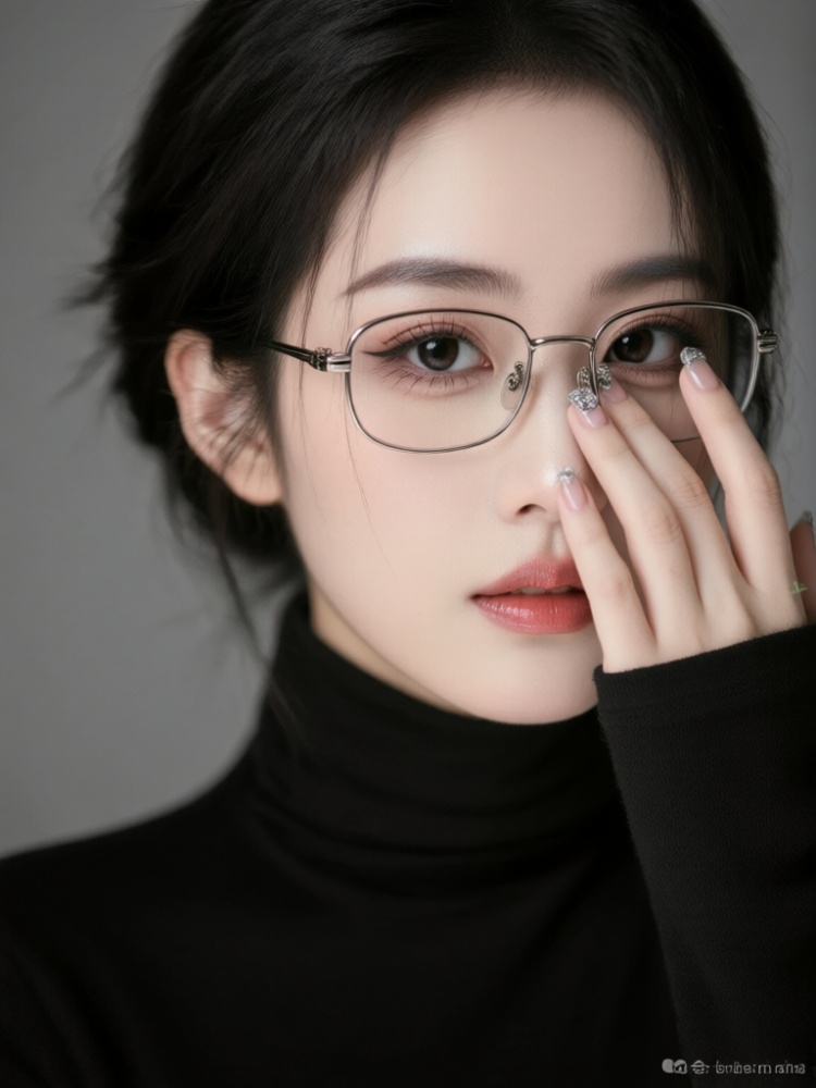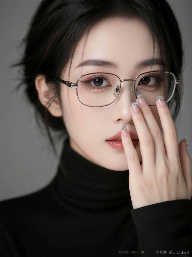 1girl, solo, looking at viewer, short hair, black hair, parted lips, glasses, black eyes, sweater, lips, sleeves past wrists, turtleneck, portrait, realistic, adjusting eyewear, black sweater