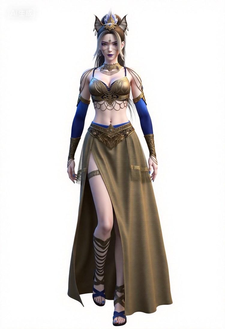 fox ears, ornate gold crown with blue gem and white feathers, amber eyes, purple eyeshadow, gold facial markings on forehead and cheeks, long dark brown hair with white highlights, high ponytail, gold and blue bra top with intricate designs, blue long sleeves with gold arm guards, sheer gold skirt with geometric patterns, multi-layered gold necklace, metal collar, gold earrings, brown sandals with blue ribbons, full-body pose,