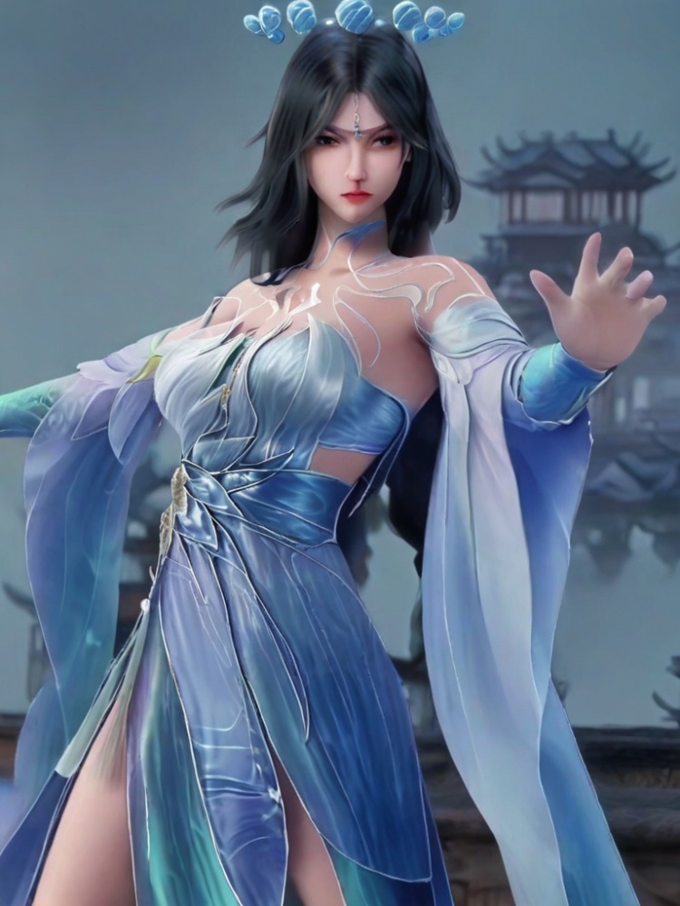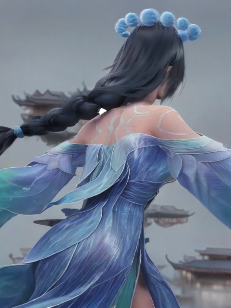 1girl,,blue dress,hair ornament,drill hair,braid,cleavage,detached sleeves,bare shoulders,barefoot,blue eyes,braided ponytail,collarbone,gem,east asian architecture,starry sky print,eyelashes,tattoo,bangs