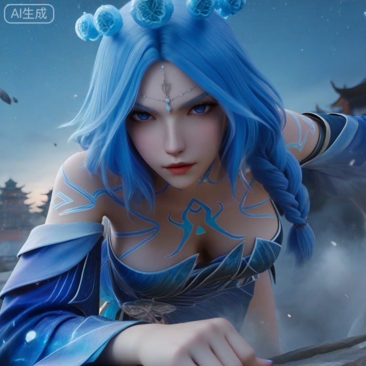 1girl,,blue dress,,,hair ornament,drill hair,braid,cleavage,detached sleeves,bare shoulders,barefoot,blue eyes,braided ponytail,collarbone,gem,east asian architecture,starry sky print,eyelashes,tattoo,bangs,,hanging blue crystal head_hair ball crown,