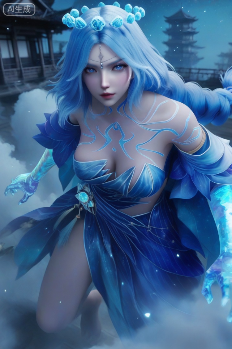 1girl,,blue dress,,,hair ornament,drill hair,braid,cleavage,detached sleeves,bare shoulders,barefoot,blue eyes,braided ponytail,collarbone,gem,east asian architecture,starry sky print,eyelashes,tattoo,bangs,,hanging blue crystal head_hair ball crown,