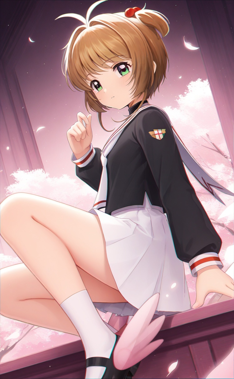 xiaoying,looking at viewer,1girl,solo,short hair,brown hair,green eyes,antenna hair,tomoeda elementary school uniform,white sailor collar,pleated skirt,white skirt,white socks,wings,mary janes,long sleeves,black shirt,