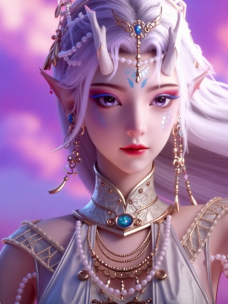 -Subject: Long haired girl with dragon horns and hair accessories -Style: curly hair with dragon horn decoration, red lips with glitter eye makeup, gorgeous off the shoulder clothing with decoration, paired with jewelry -Art style/image quality: Ultra fine 3D rendering, high-definition image quality -Composition/Perspective: Close up (facial close-up)+full body view, front/side shooting -Posture/expression: dynamic postures such as raising hands/bending over, cool expression -Background/Match: Pink purple clouds+water surface, dark dragon. Ultra fine 3D rendering, high-definition picture quality; Long haired girl with dragon horns and hair accessories, styled with coiled hair; Red lips and sparkling eye makeup, gorgeous off the shoulder decorative clothing, paired with jewelry; Close up close-up/full body view, front/side view; Dynamic posture of raising/bending over, with a cool expression; Background: Pink purple clouds and water surface, accompanied by dark dragons