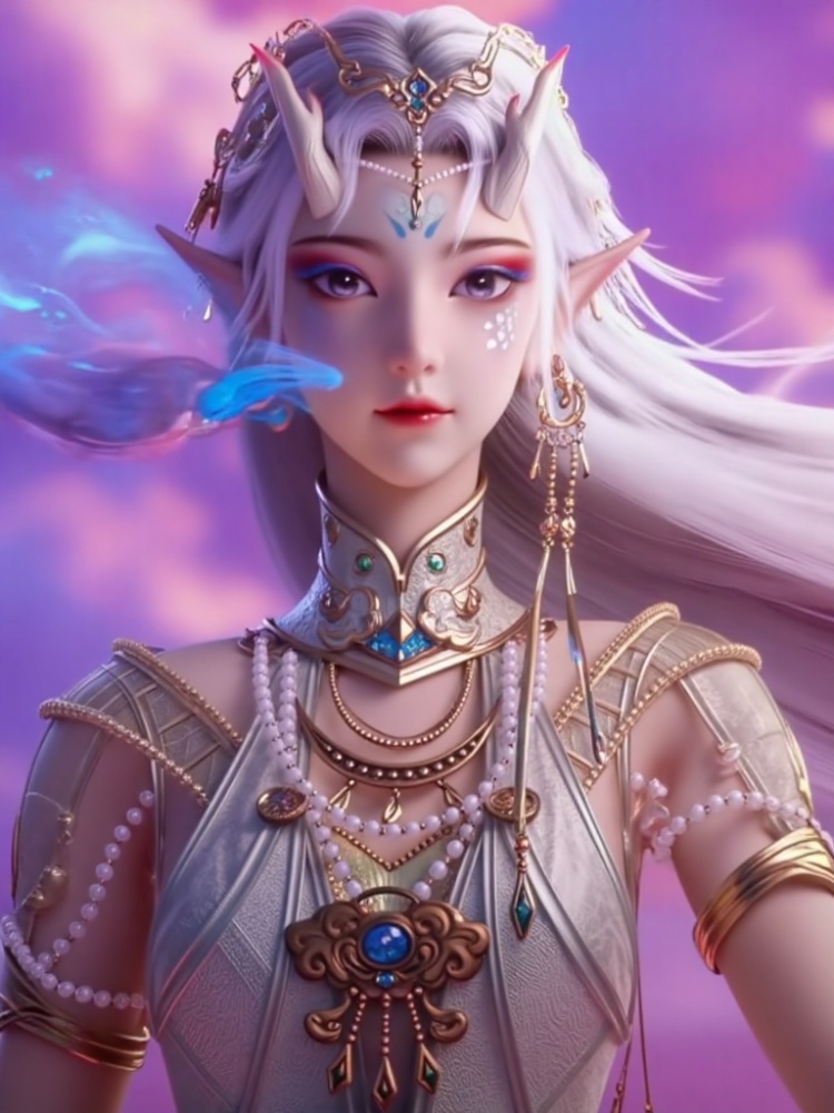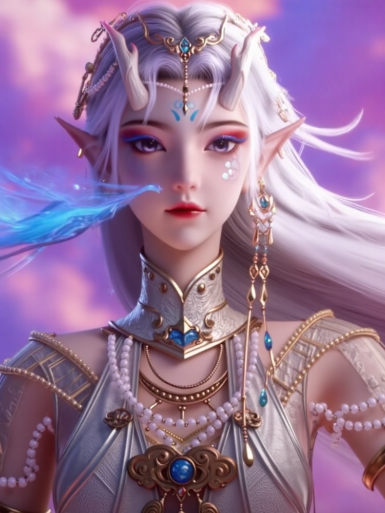 -Subject: Long haired girl with dragon horns and hair accessories - Style: curly hair and dragon horn decoration, red lips and sparkling eye makeup, gorgeous off the shoulder clothing with decoration, matched with jewelry - Style/Image quality: ultra-fine 3D rendering, high-definition image quality - Composition/perspective: close-up (facial close-up)+full body view, front/side shooting - Posture/expression: dynamic posture such as lifting hands/bending over, cool expression - Background/combination: pink purple clouds+water surface, dark dragon. Ultra fine 3D rendering, high-definition picture quality; Long haired girl with dragon horns and hair accessories, styled with coiled hair; Red lips and sparkling eye makeup, gorgeous off the shoulder decorative clothing, paired with jewelry; Close up close-up/full body view, front/side view; Dynamic posture of raising/bending over, with a cool expression; Background: Pink purple clouds and water surface, accompanied by dark dragons