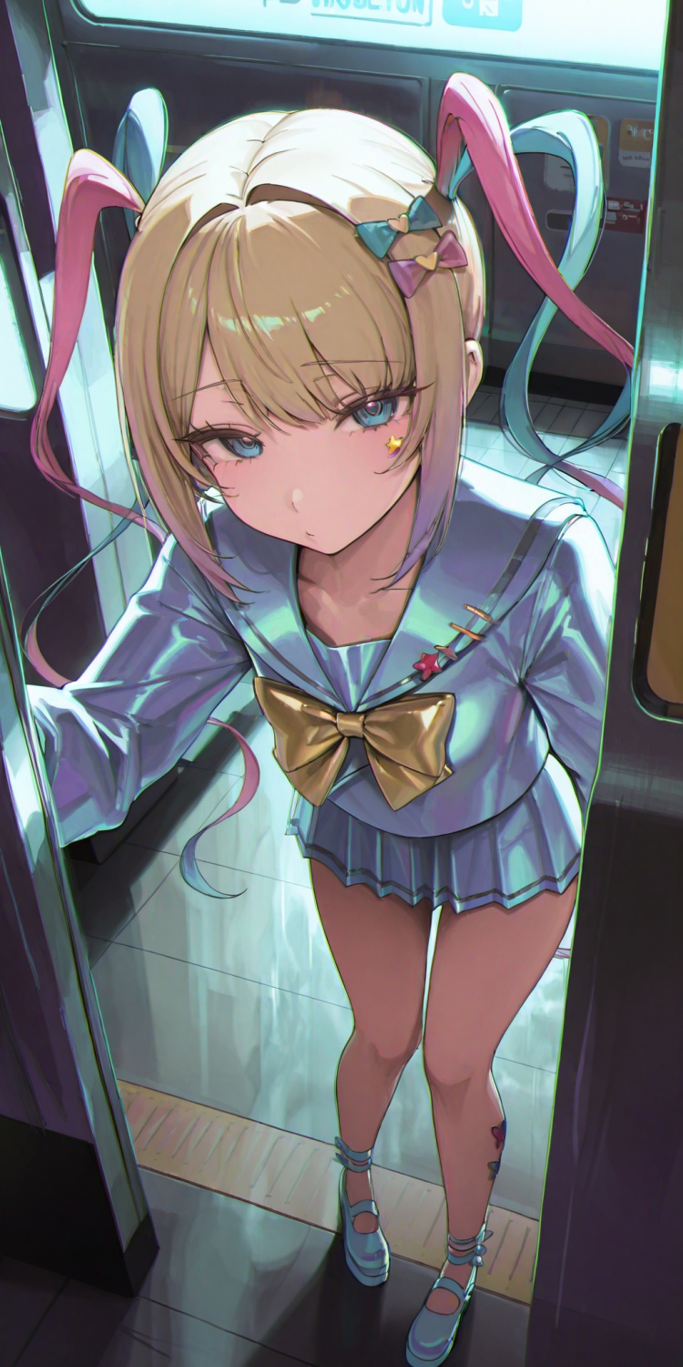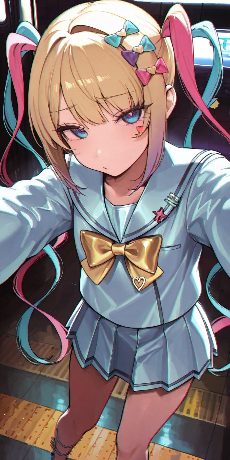 kangel, blue eyes,golden with purple gradient hair,blue and pink spiral twintail,very long hair,kangel bow tie clip, kangel sailor uniform,long sleeve,big golden bow,ribbon bow,laser texture clothes,kangel buckled straps, straps on calf,kangel heart sticker,sticker on calf,bare legs,kangel mary jane shoes,bare legs,