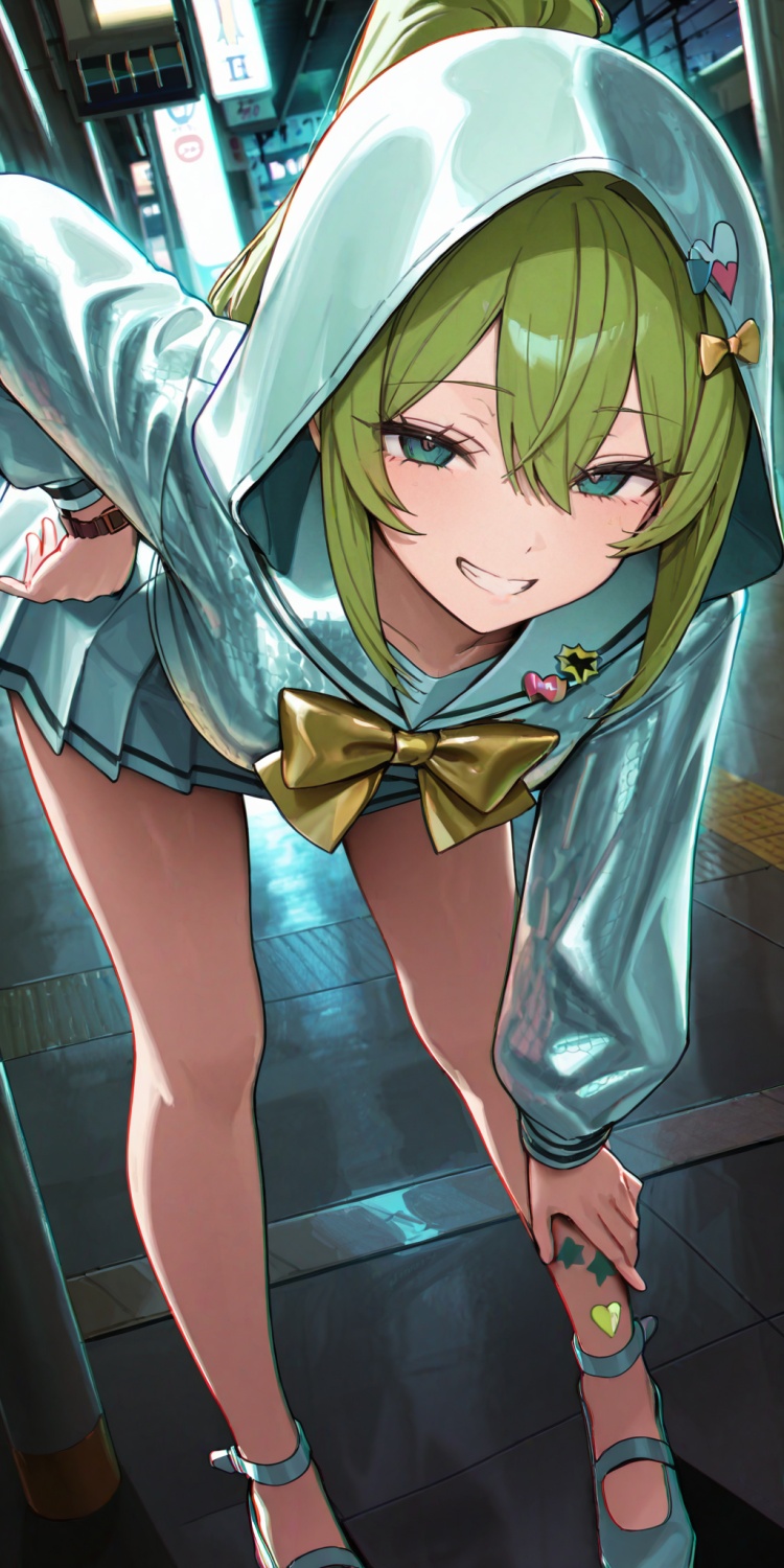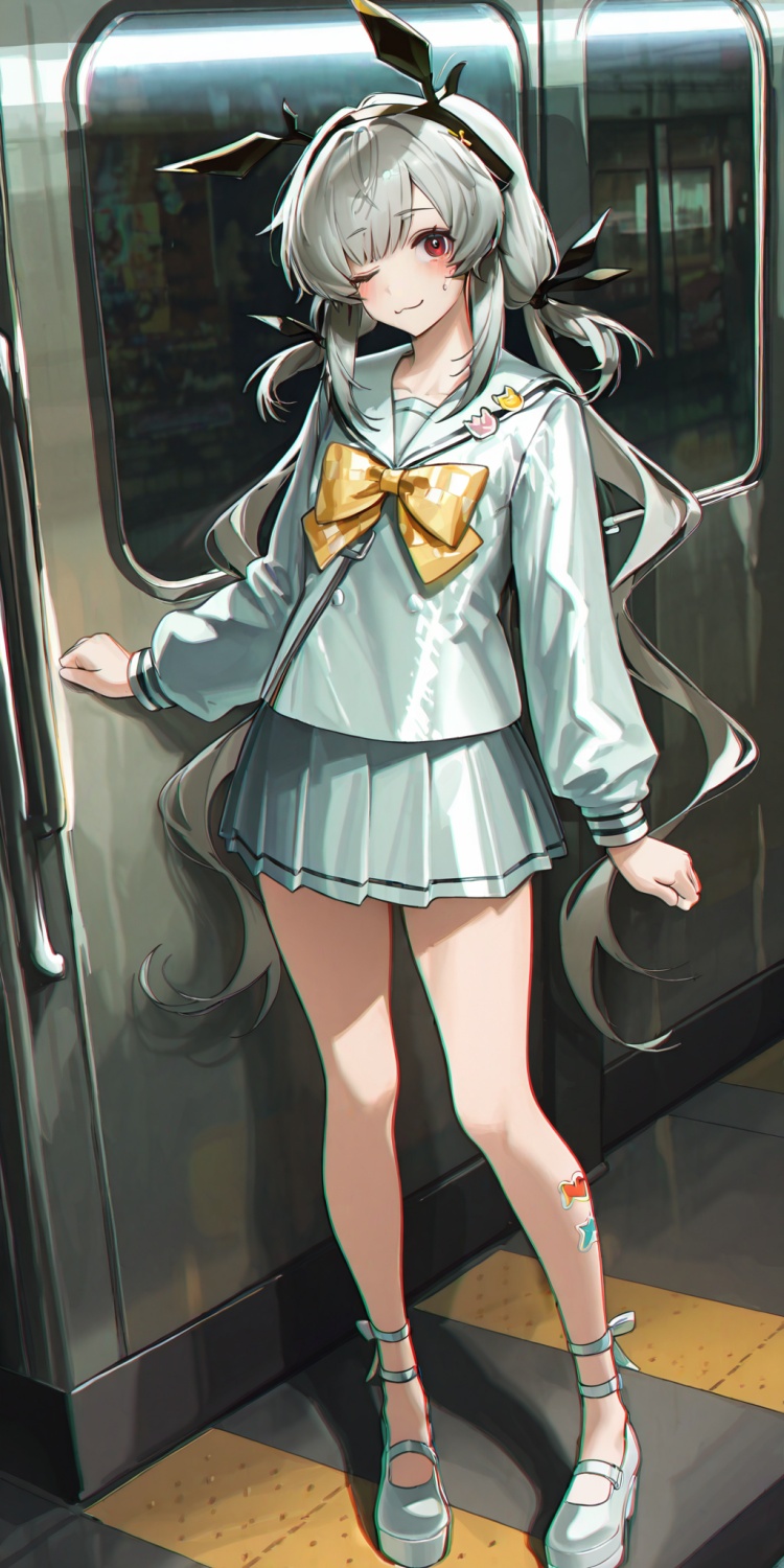 服装: kangel sailor uniform,long sleeve,big golden bow,ribbon bow,laser texture clothes,kangel buckled straps, straps on calf,kangel heart sticker,sticker on calf,bare legs,kangel mary jane shoes,bare legs