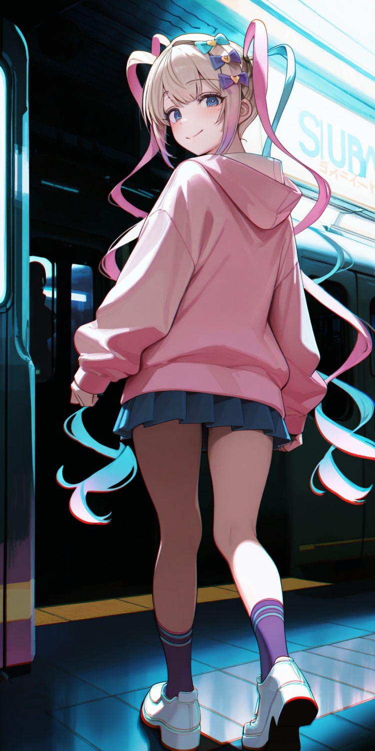 人物描述:blue eyes,golden with purple gradient hair,blue and pink spiral twintail,very long hair,kangel bow tie clip