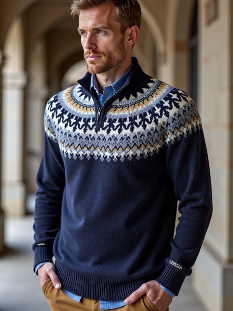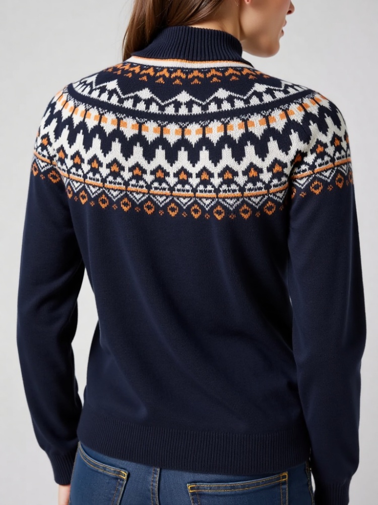 The Fair Isle pattern, with its unique weaving techniques and patterns that naturally carry a subtle ethnic atmosphere, appears in the form of local accents or full print distribution.