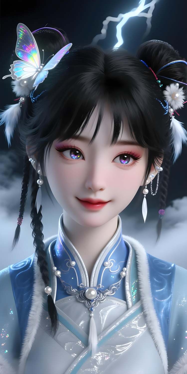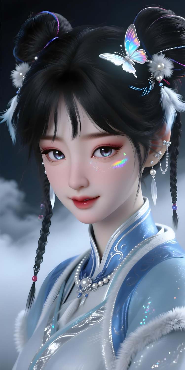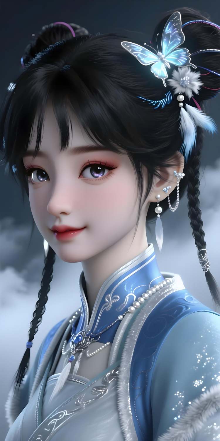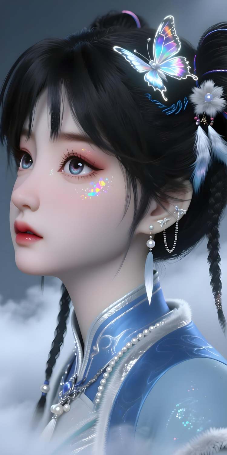 还原提示词:1girl, solo, double bun, jewelry, earrings, black hair,hair ornament, braid, chinese clothes,realistic, pom pom (clothes),black eyes, fur trim, long sleeves, wide sleeves,dress, brown eyes, bangs, tassel, hair flower,sash,
