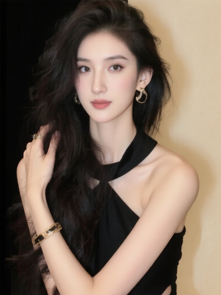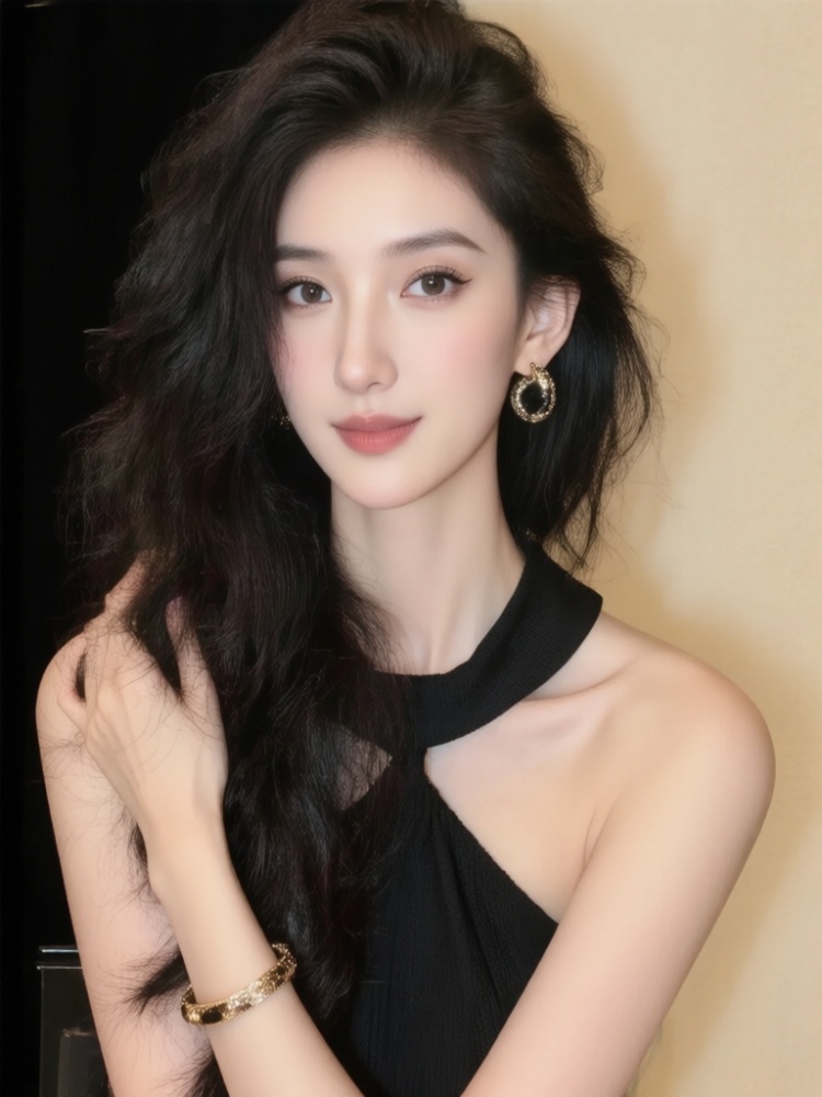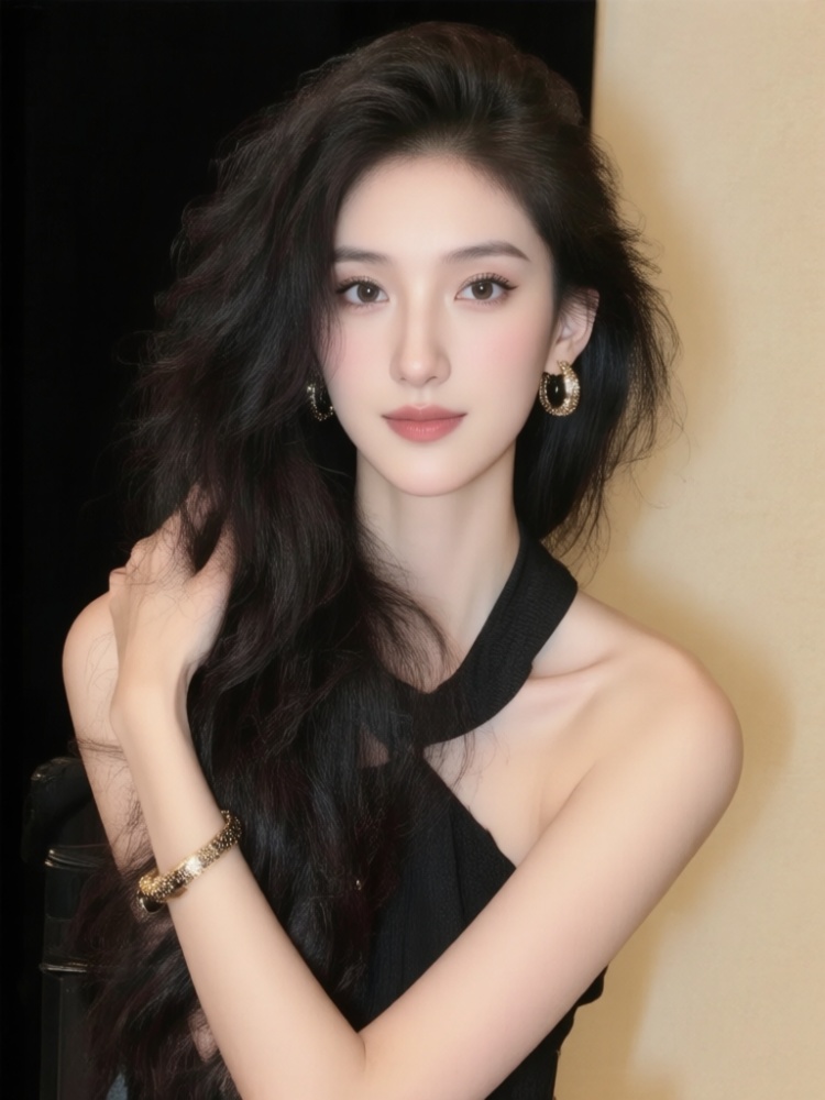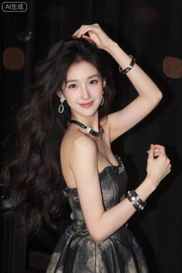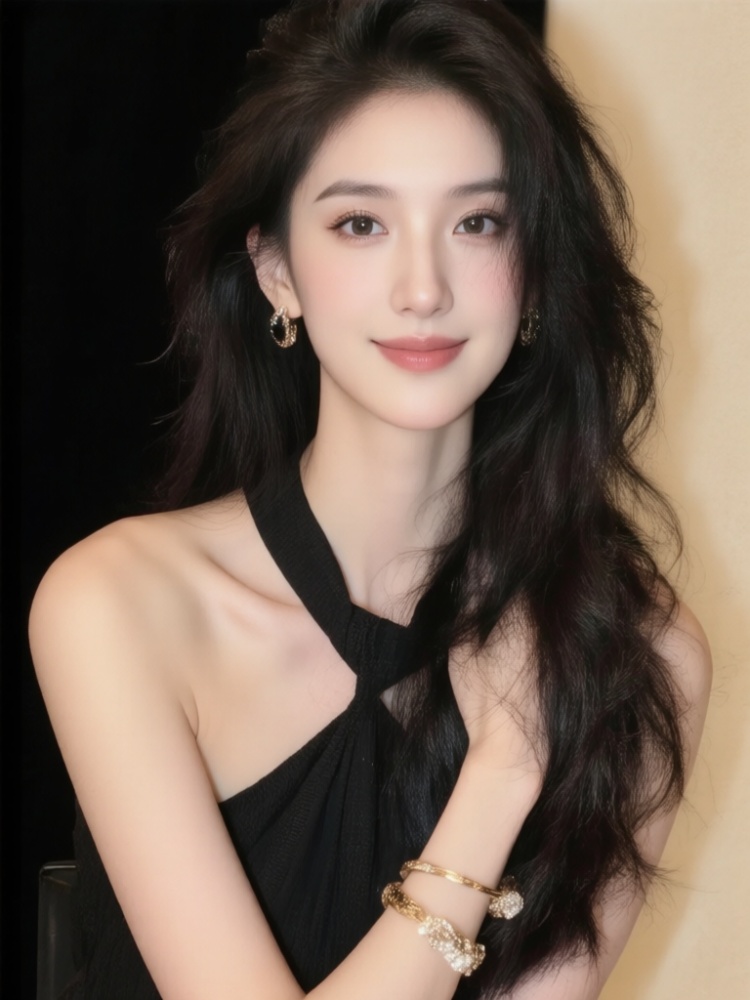 1girl, solo, long hair, looking at viewer, smile, black hair, dress, bare shoulders, jewelry, closed mouth, upper body, earrings, black eyes, black dress, bracelet, lips, realistic