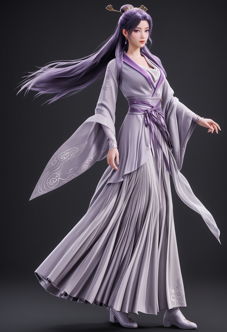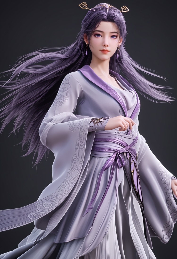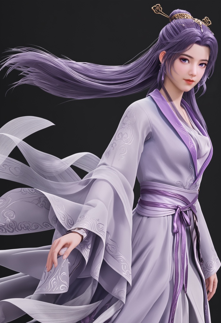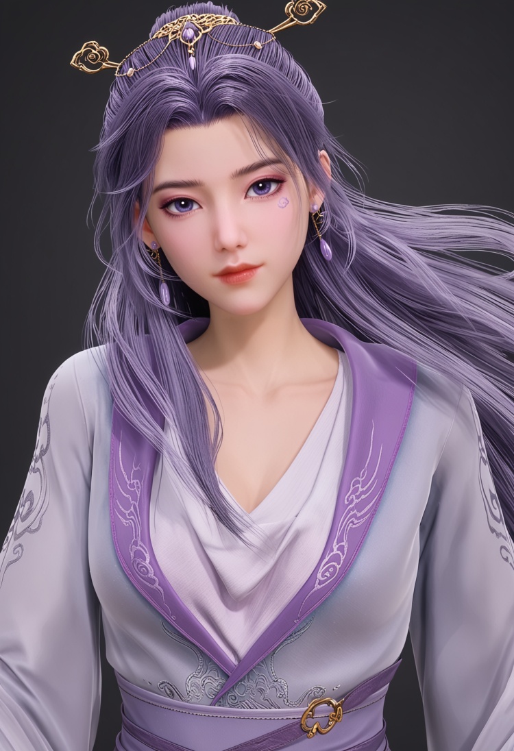 (q1528437228:1.2),long_hair,solo,1girl,purple_hair,hair_ornament,purple_eyes,jewelry,earrings,realistic,dress,long_sleeves,hair_bun,chinese_clothes,hanfu,blue_eyes,hair_stick,