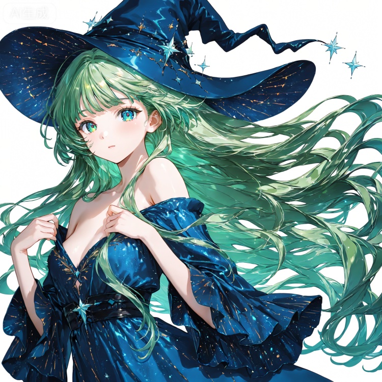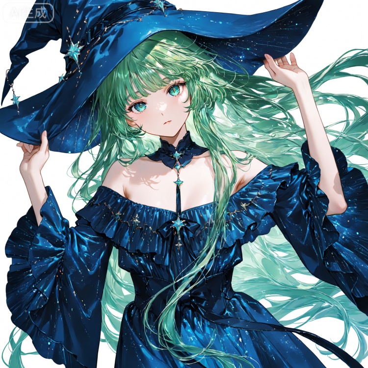 1girl, solo, long hair, looking at viewer, bangs, blue eyes, simple background, long sleeves, hat, white background, dress, bare shoulders, very long hair, green eyes, upper body, green hair,wide sleeves, off shoulder, witch hat, blue dress, blue headwear, witch