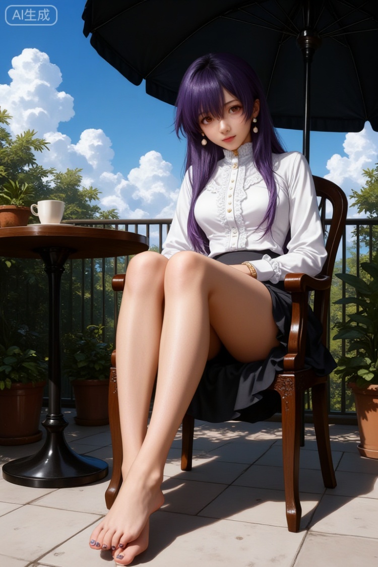 The image shows a young woman with long red hair sitting on a wooden chair with a white umbrella above her head. She is wearing a white blouse and a black skirt with a ruffled hem. Her legs are crossed and her feet are bare. She has a serious expression on her face and is looking directly at the camera. The background shows a balcony with potted plants and a blue sky with white clouds. There is a small table with a glass of orange juice on it next to the chair. The overall mood of the image is peaceful and serene.