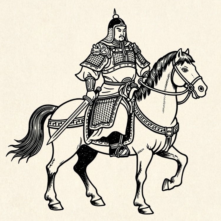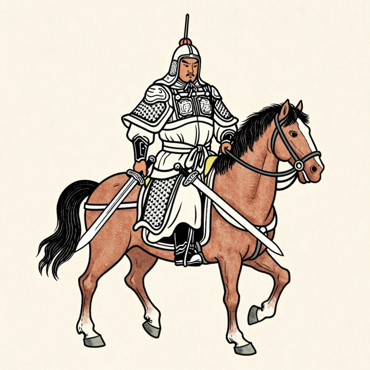 ZiTBMWujiang, The image depicts a traditional Chinese warrior on horseback, dressed in detailed armor and wielding a sword. The warrior's attire includes intricate patterns and a long flowing cape, and the horse is depicted with a strong, muscular build. The background is plain, with no additional objects or scenery, allowing the focus to remain on the warrior and his steed. The image is drawn in a classic style, likely inspired by historical or mythological depictions of Chinese warriors.