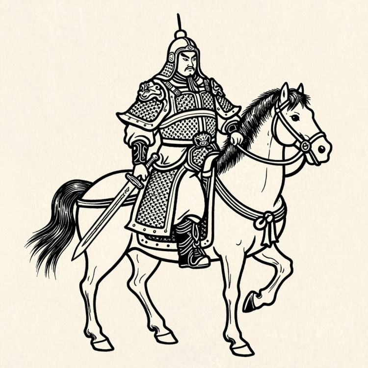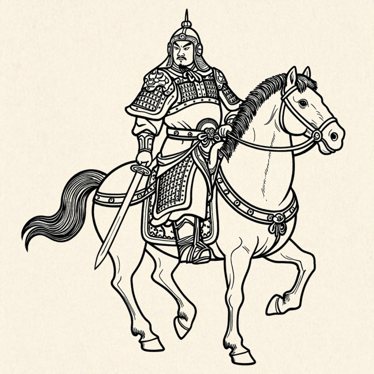 ZiTBMWujiang, The image depicts a historical figure in traditional armor riding a horse. The figure is pointing with one hand while holding a sword in the other. The horse is adorned with decorative elements, and the rider is wearing a helmet and a detailed, ornate outfit. The background is plain, with no additional objects or scenery visible. The image is drawn in a black-and-white line art style, emphasizing the details of the armor and the horse.