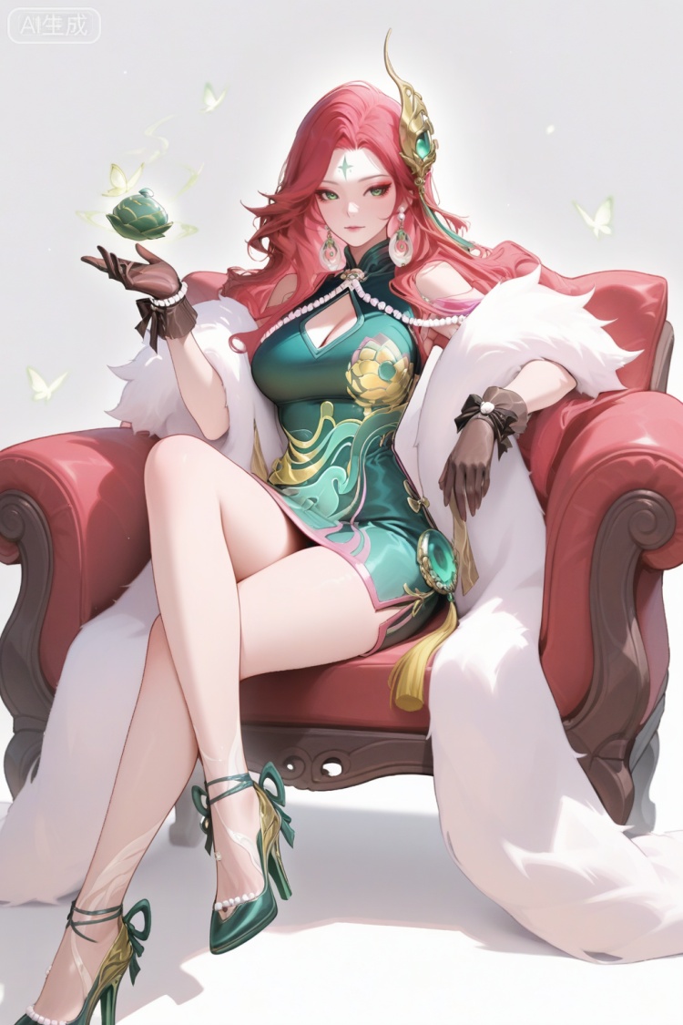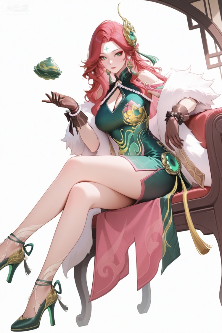 1girl,fmly,solo,red-pink long hair,green eyes,eyeshadow,long hair,makeup,facial mark,forehead mark,jewelry,earrings,hair ornament,breasts,cleavage,dress,green dress,china dress,clothing cutout,cleavage cutout,white fur shawl,waist pendant,tassel,see-through ribbon,black gloves,see-through gloves,bow gloves,pearl bracelet,pearl,ornate high heels,gold trim high heels,foot decoration,bare legs