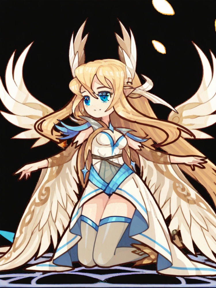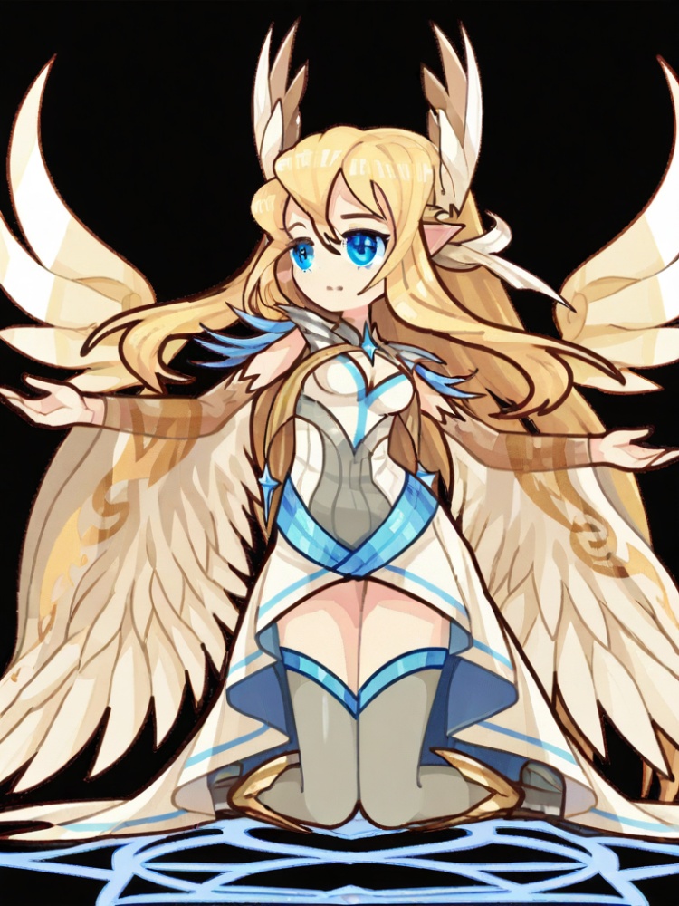 yinhe,solo,blonde hiar,hair ornament,bangs,long hair,hair ornament,tiara,laurel crown,bangs,hair between eyes,blue eyes,pointy ears,white dress,cleavage cutout,thighhighs,boots,feathered wings,multiple wings,detached sleeves,wide sleeves,see-through sleeves,1girl,