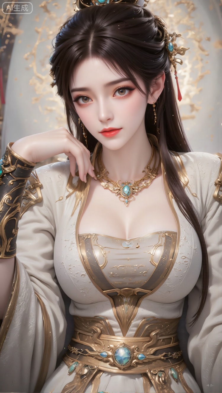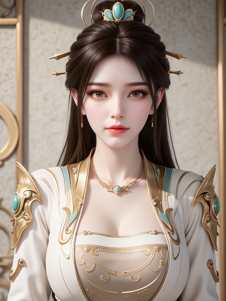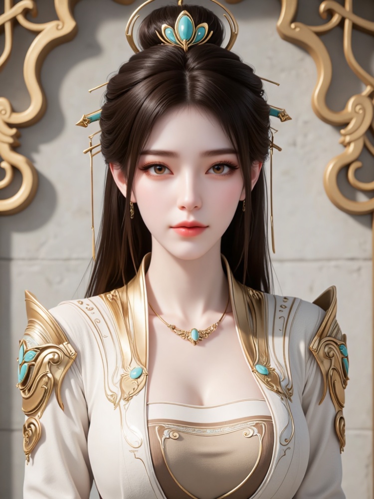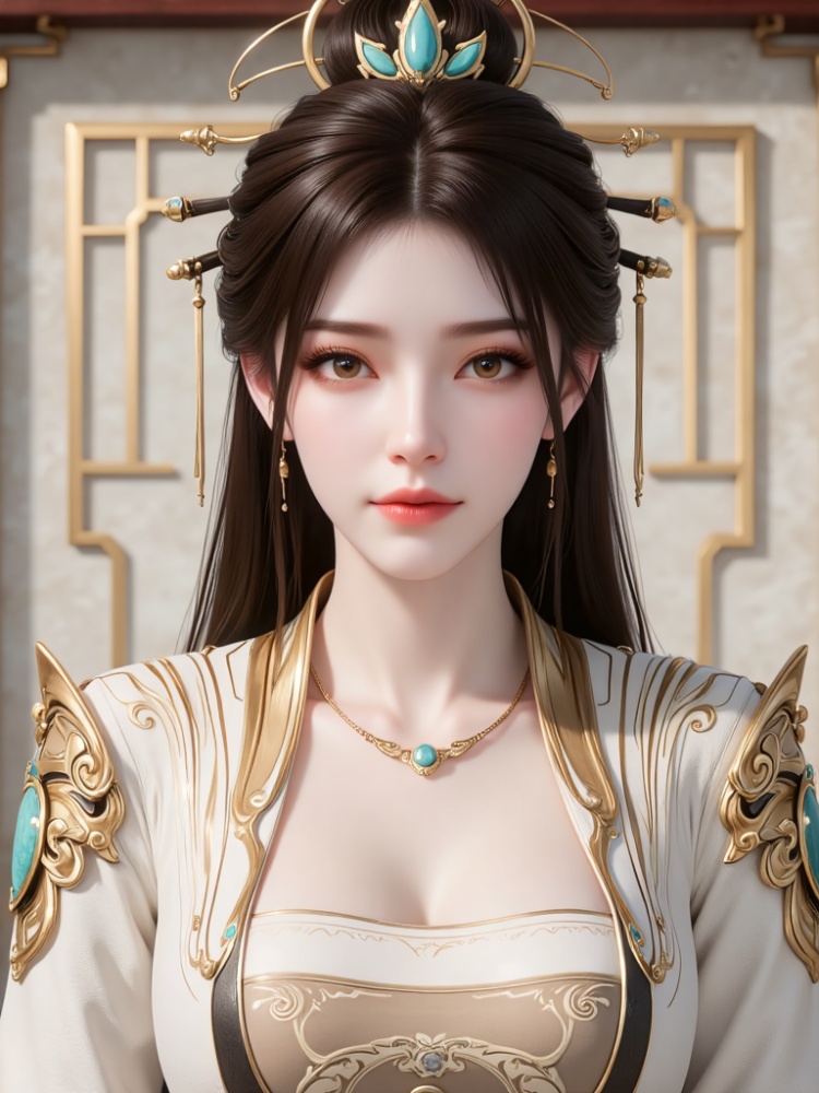Full - length view, a woman in magnificent ancient - style clothing. Her long black hair is tied up high, adorned with a golden hair crown and hairpins decorated with turquoise gems. The clothing features a dominant color scheme of white and gold, with exquisite metal decorations showcasing delicate patterns in gold and turquoise on the shoulders and arms. She also wears an inner garment with golden patterns. Around her neck is a golden necklace inlaid with turquoise gems. Her makeup is exquisite, with soft eye makeup and rosy lips. The background is a wall with Chinese - style hollow patterns and light tones.
