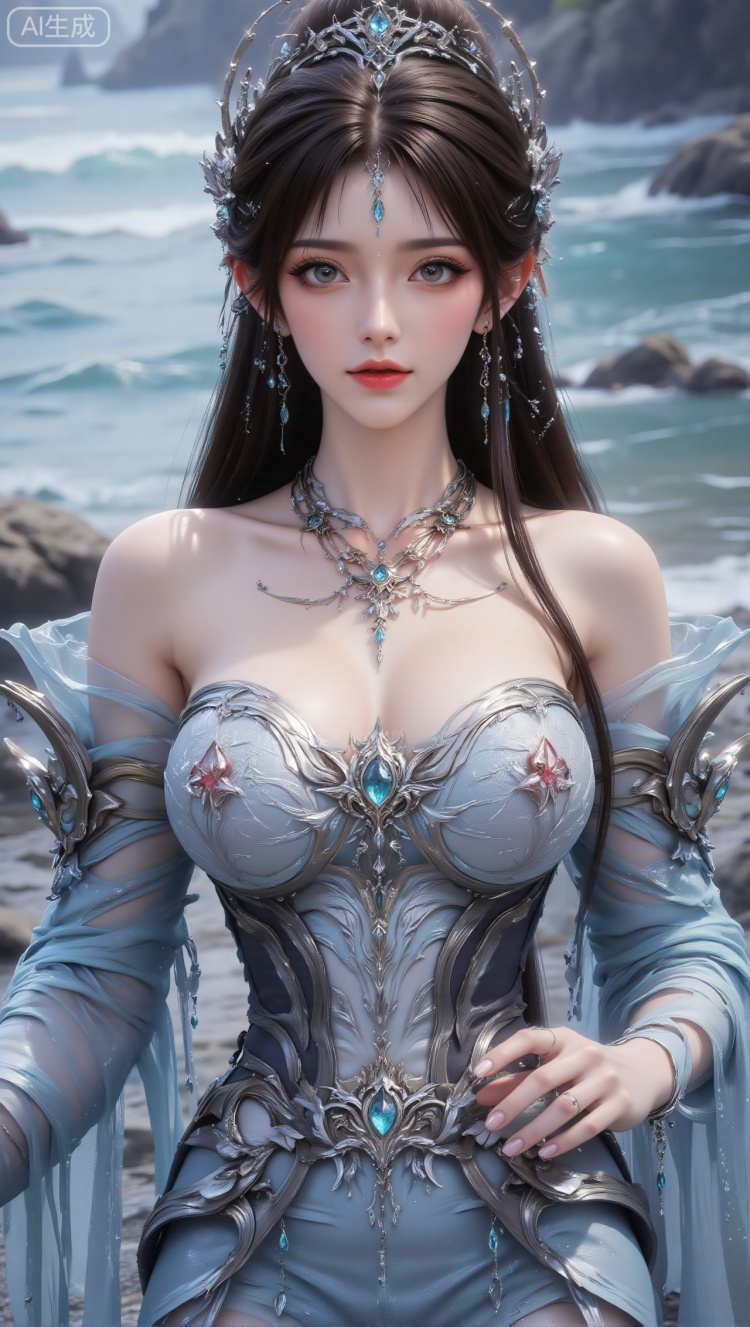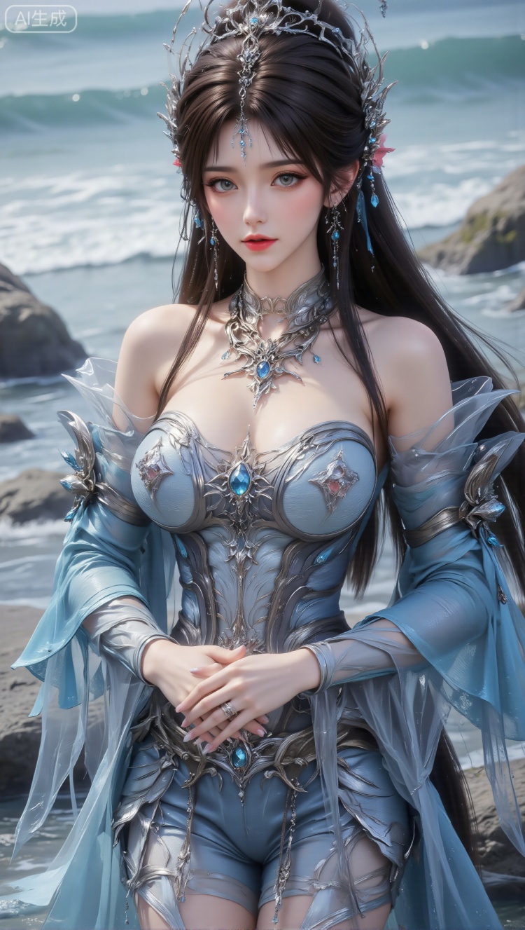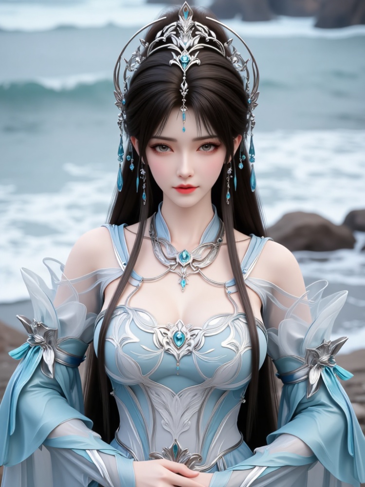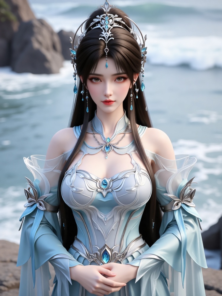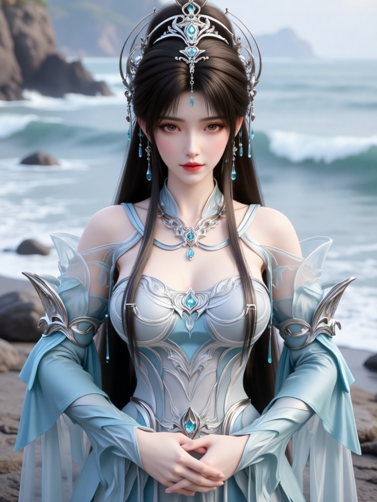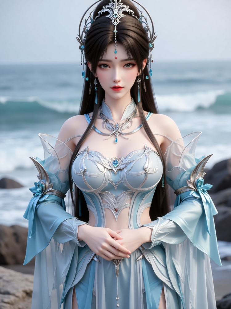 Panoramic view, a woman in gorgeous Xianxia - style clothing. The clothing is mainly light blue and silver white, with an exquisite and intricate design, featuring transparent tulle and metallic decorations. There are flowing blue and white sleeves on the shoulders and cuffs. She wears silver necklaces and gem - inlaid ornaments on her chest and neck. On her head, there is a complex and exquisite silver - blue hair crown, with tassels with teardrop - shaped gemstones hanging from her hair, and the earrings are matching sapphire tassel styles. Her long hair is black and shiny, and she has a dignified posture with her hands crossed in front of her. The background is a seaside scene with rolling waves and rocks. The whole picture is delicate and beautiful, full of Xianxia fantasy atmosphere.