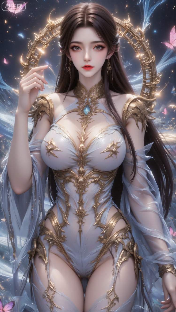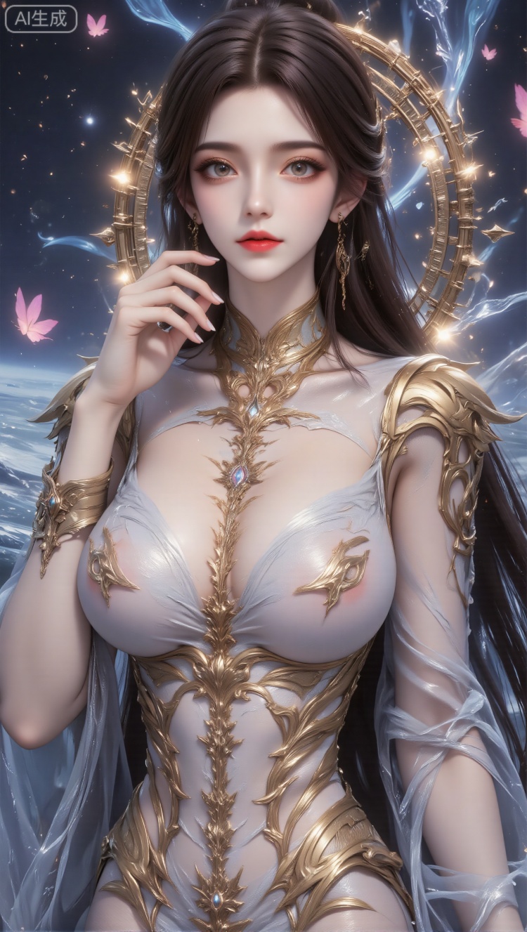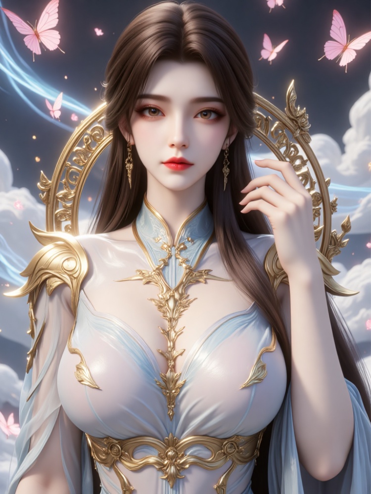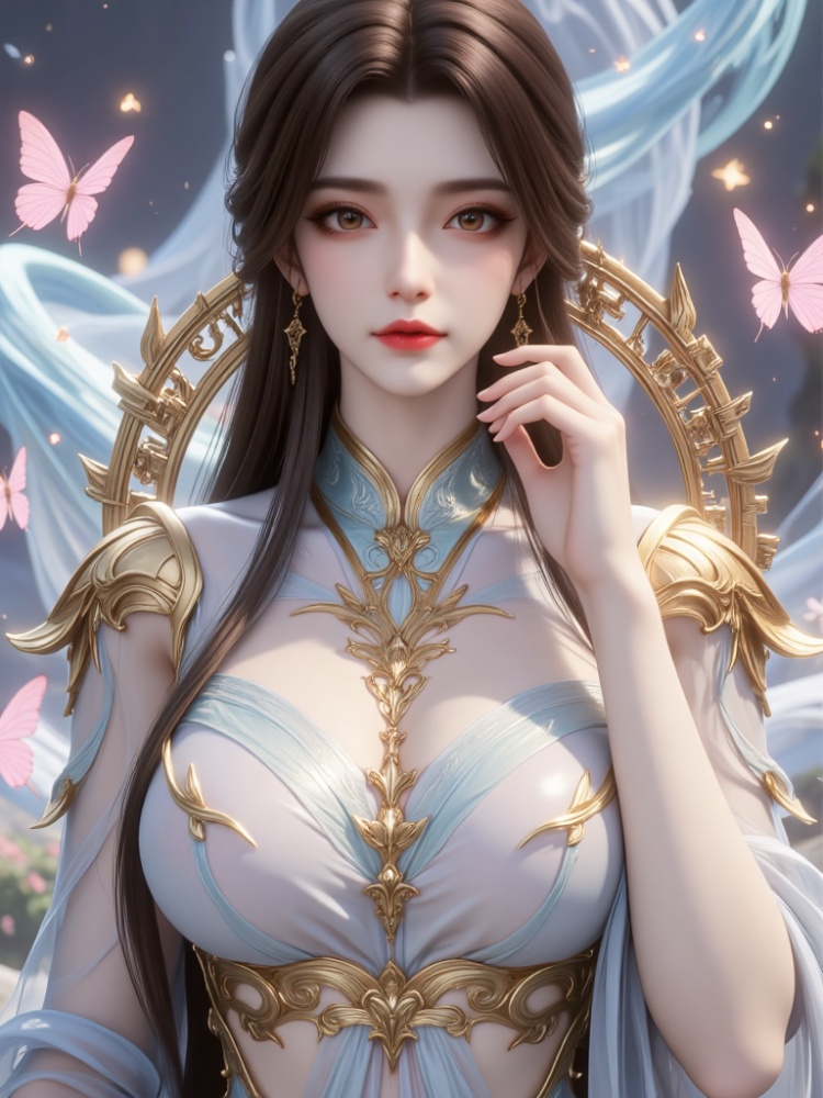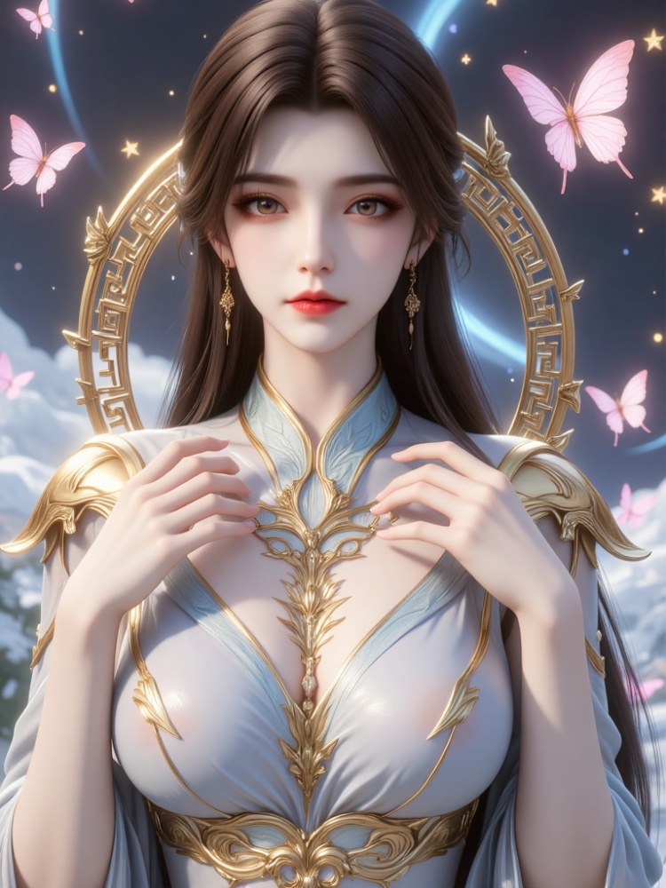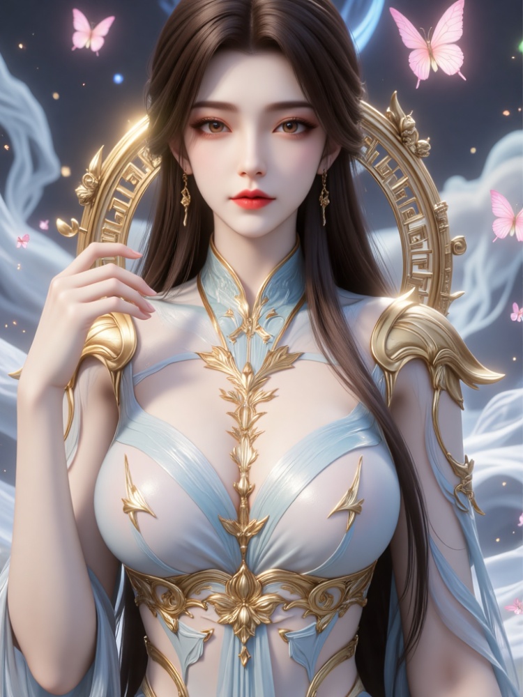 Panoramic view, 3D rendering, a woman in gorgeous Xianxia - style clothing. The clothing is mainly light blue and gold, with an exquisitely complex design and made of transparent - textured fabric. There are exquisitely detailed golden patterns decorating the neck and shoulders, exhibiting luxury and full of fantasy texture. Her long hair is smooth and flowing, and she wears matching golden earrings. With an elegant posture, one hand is gently raised near the face, looking gentle and lively. There is a golden circular luminous accessory with delicate carvings at the back, adding a sacred and dreamy atmosphere to the whole. The background is a Xianxia scene with starry dots and blue streams of light lingering, and pink butterflies are fluttering gracefully.