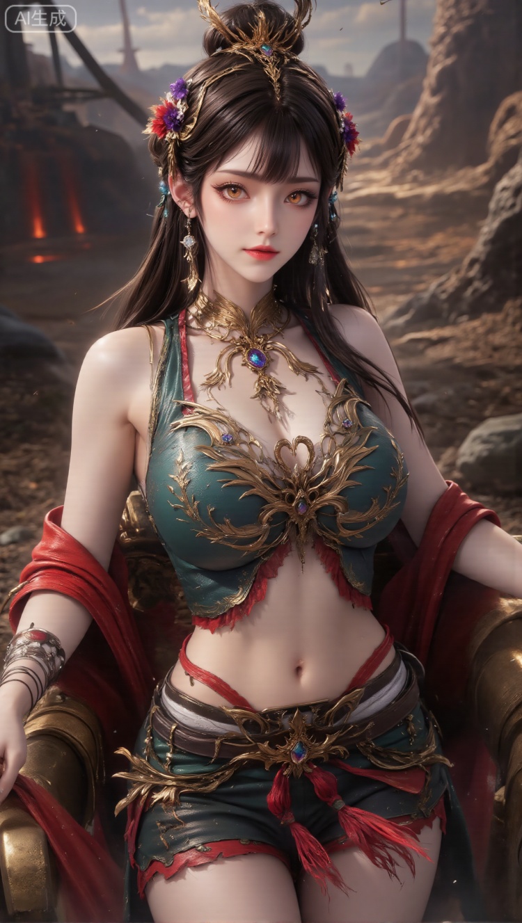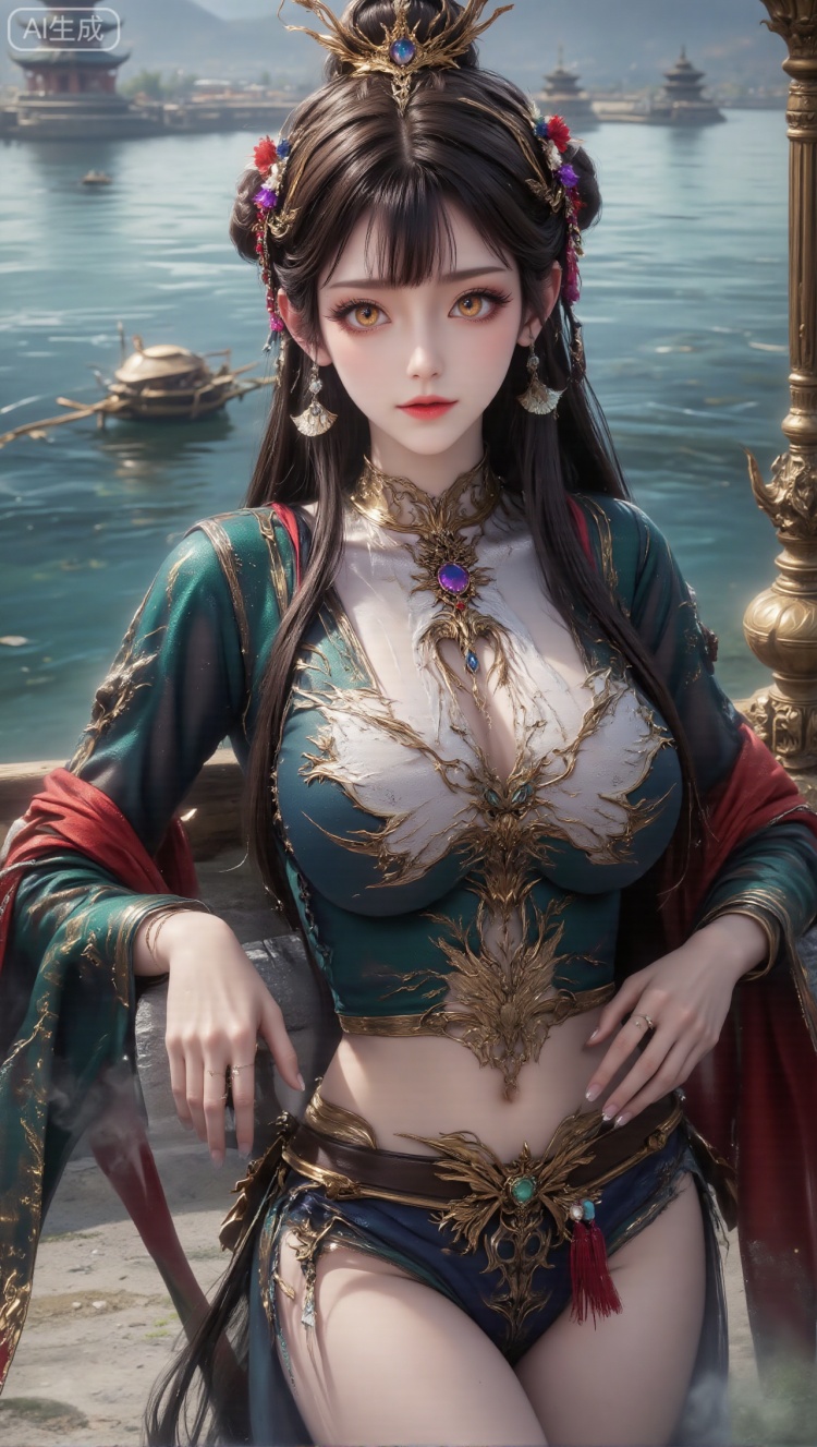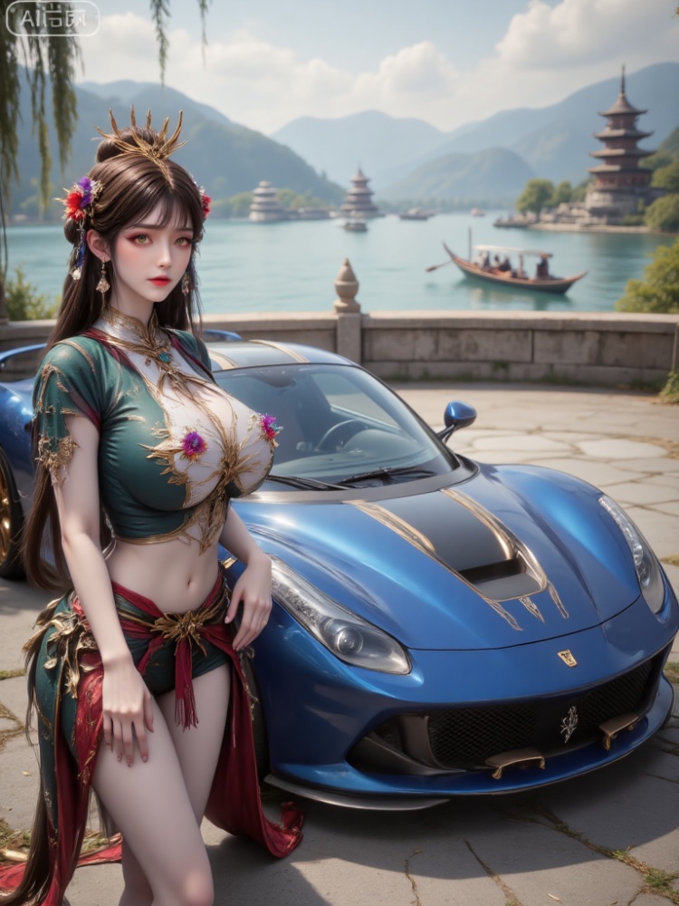 Full body portrait of a woman, with long hair combed into a delicate bun, wearing a golden headdress with complex patterns, and red, purple, and white flower decorations in the hair; the earrings are fan-shaped and matched with blue gems; the top is a short dark green style, decorated with large and complex golden patterns, and is also paired with a light-colored stand-up collar with exquisite details and a red shawl; the makeup is exquisite, amber. The pupils are bright and moving. The panoramic view of Hangzhou West Lake Sudi, 360-degree surrounding lake, weeping willows and the Leifeng Pagoda in the distance. The complete lake blue color Ferrari (streamlined vehicle + metal trim) is parked in the viewing parking area. A woman with oversized breasts is squatting next to the car, with her hands on the bumper, leaning over to observe the reflection of the car. In the background are rowing cruise ships and the emerald green lakeshore. The overall view of the car is integrated with the scenery of the lake and mountains.