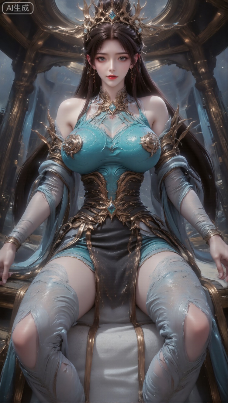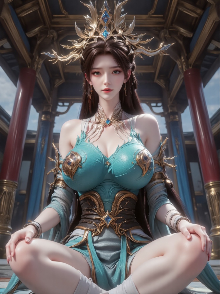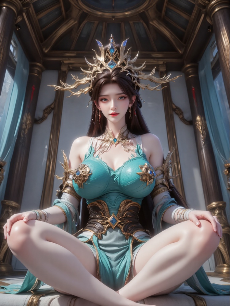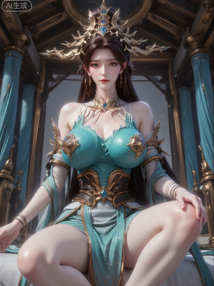 Panoramic view, a woman with jet - black long hair piled high, wearing an exquisite and complex golden headdress (inlaid with blue gemstones, featuring a flowing branch - and - leaf design); she has exquisite earrings with blue gemstones and a star - shaped gem necklace around her neck. She is dressed in a magnificent top dominated by turquoise and matched with golden decorations; the fabric is glossy, with exquisite patterns and three - dimensional decorations with a metallic texture (the chest decoration is rich in layers like petals or wings). The shoulders are decorated with flowing sleeve ornaments in light blue and gold, which have patterns and shapes with a metallic texture. A wide black belt with golden patterns is tied around her waist. The woman sits cross - legged on a white platform, with her hands resting on both sides of the platform for support. The background has dark roof beams with exquisite patterns, paired with blue drooping curtains. The overall environment is elegant, and the light is soft, creating a classical and elegant indoor atmosphere.