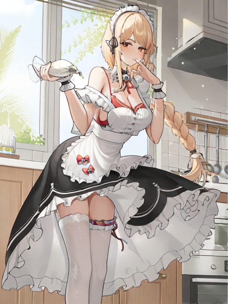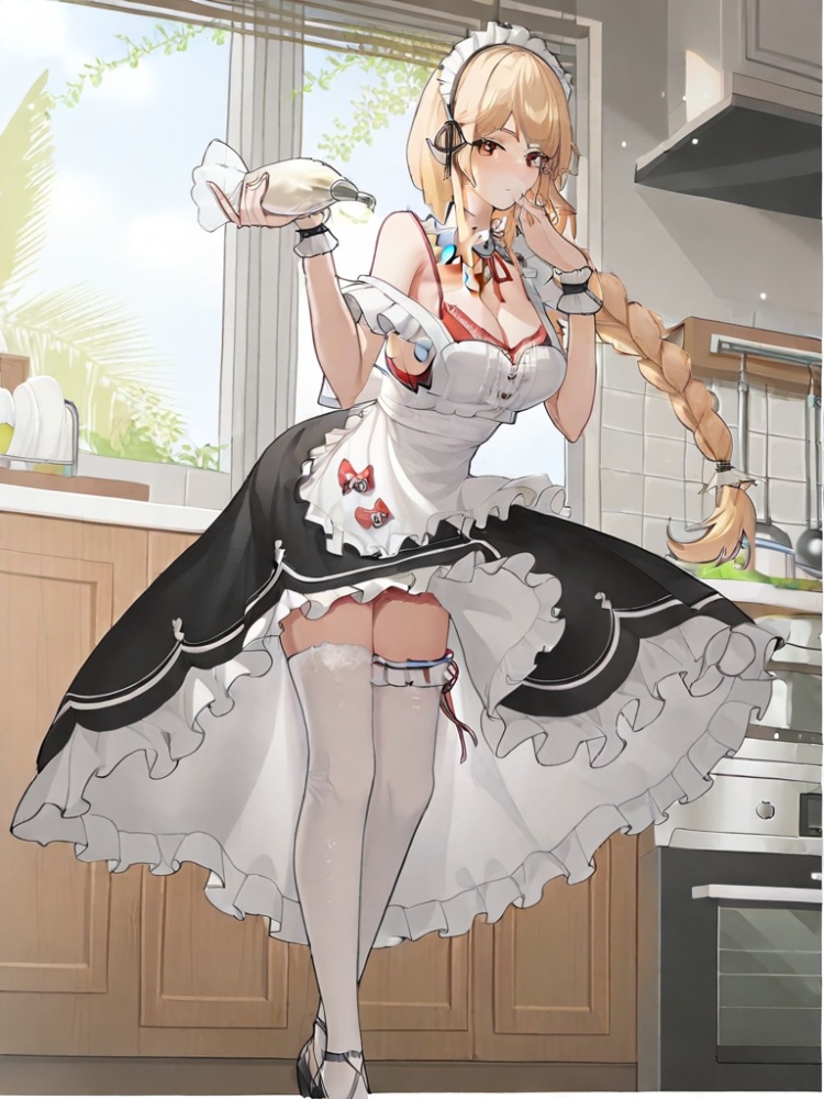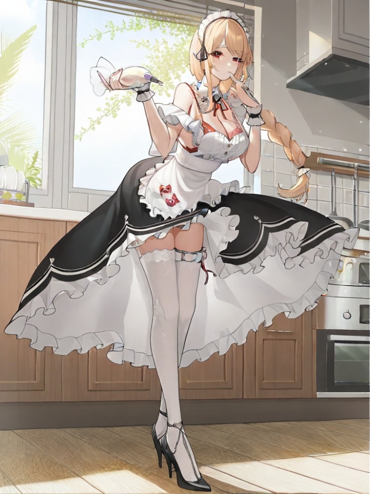 yinhe,solo,long hair,breasts,blush,bangs,blonde hair,large breasts,red eyes,thighhighs,dress,cleavage,bare shoulders,braid,frills,black footwear,apron,high heels,white thighhighs,maid,maid headdress,single braid,detached collar,maid apron,braided ponytail,kitchen,black skirt,long skirt,pointy ears,neck ribbon,neckbell,red bra,bra,thigh strap,garter straps,1girl,frilled apron,wrist cuffs