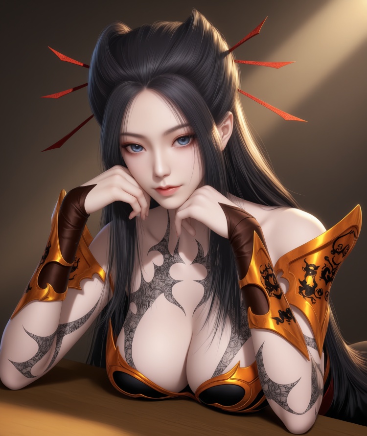 <lora:焰灵姬-ill:0.83>,yanlingji,1girl,solo,long hair,black hair,hairpin,blue eyes,tattoo,----注释:人物属性-----