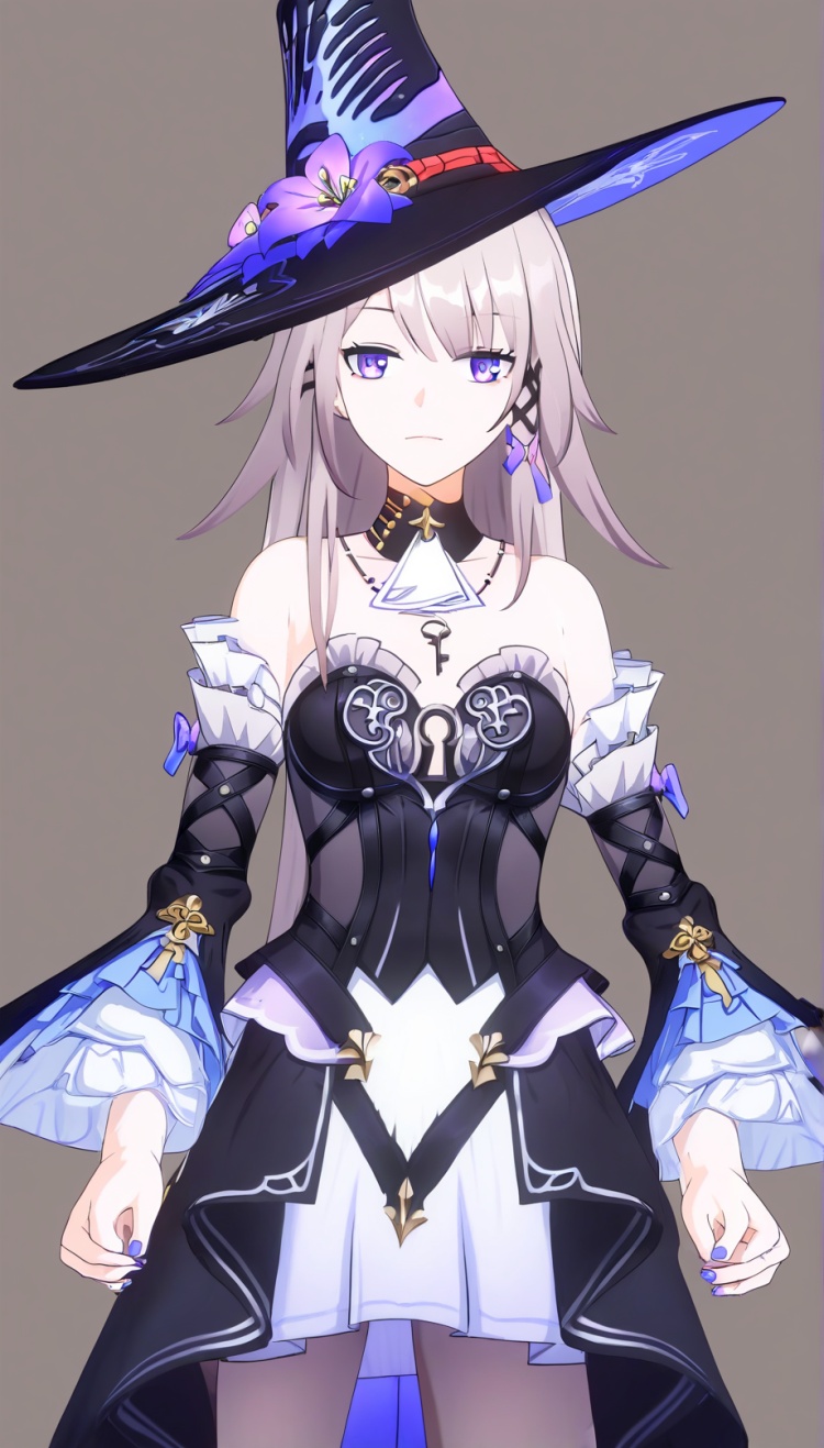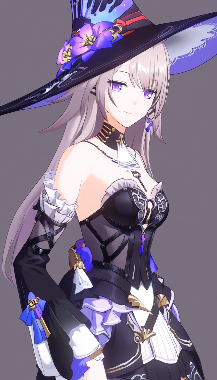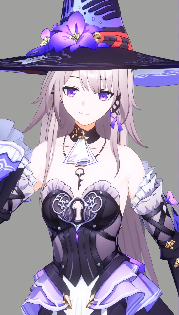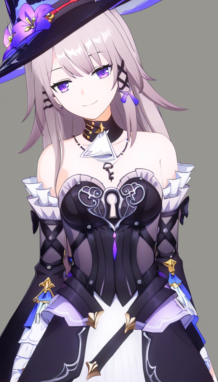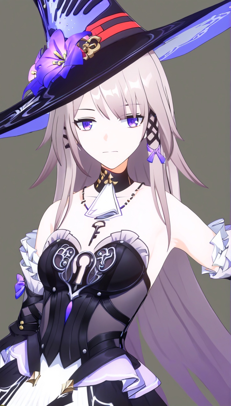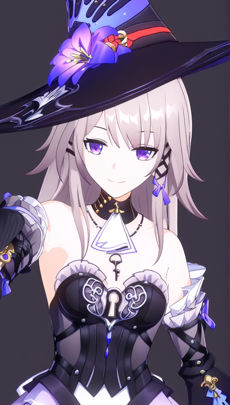 (best quality,8K, masterpiece,simple background,none background :1.3),anime,The Herta, 1girl, young,solo,hat,purple eyes,closed mouth,long hair, detached sleeves, earrings,clevage,medium breasts,standing, key necklace,face focus,light smileNotes: