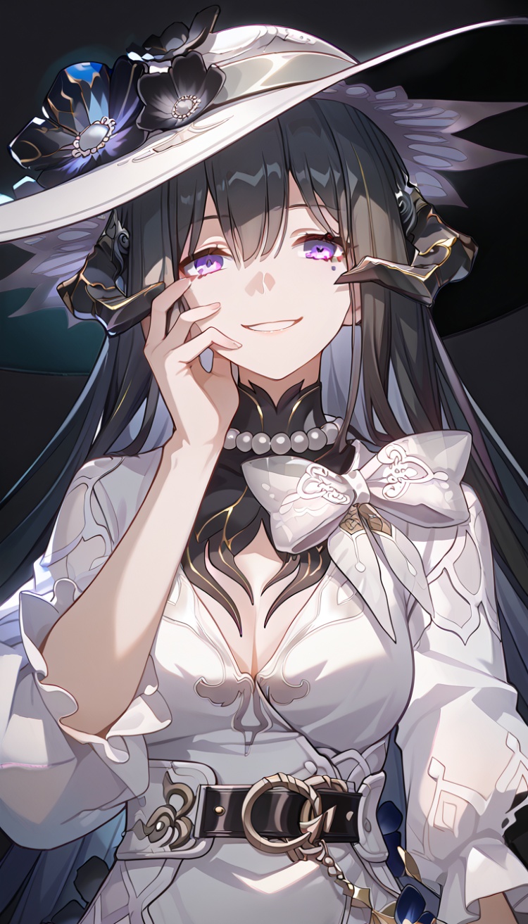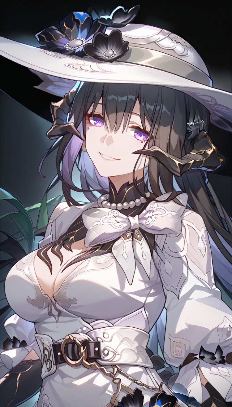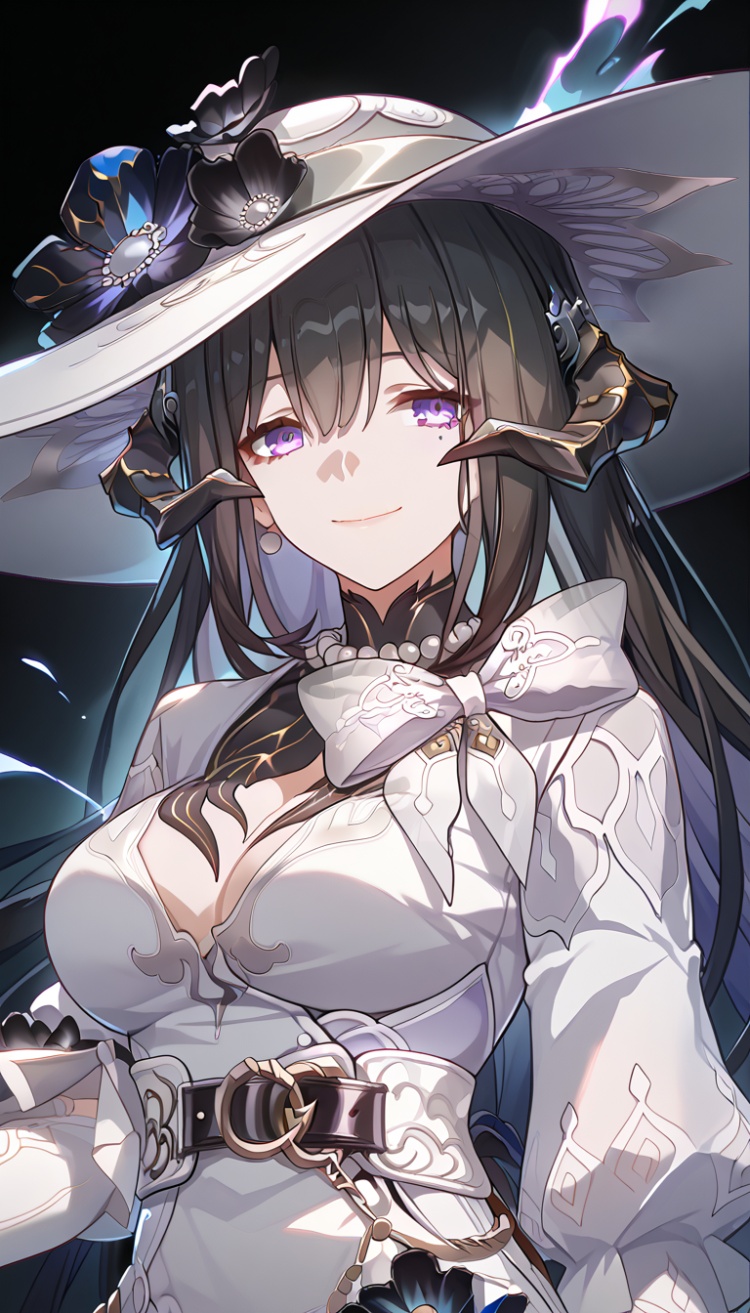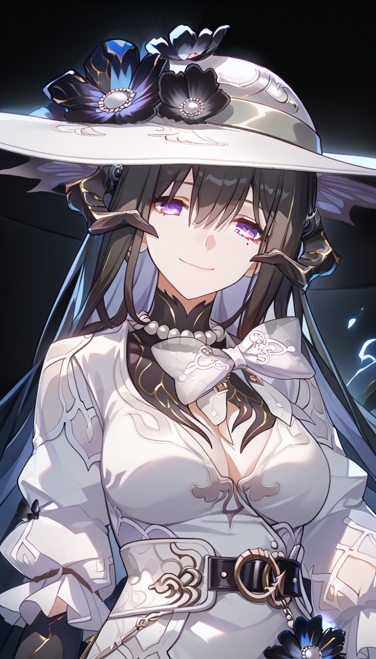 1girl, solo, Constance, hat, dress, upper body, smile, medium breasts, epic, dramatic, detailed light, masterpiece, best quality, very aesthetic,