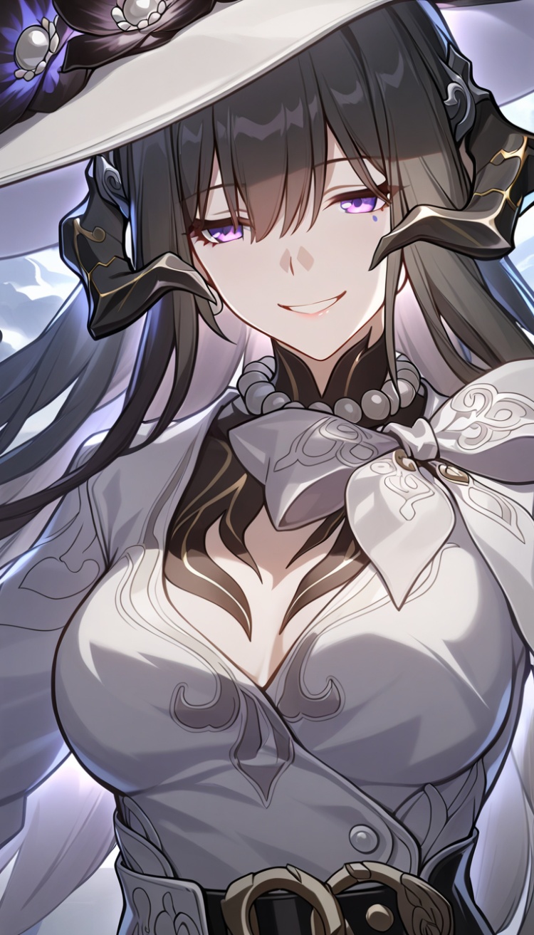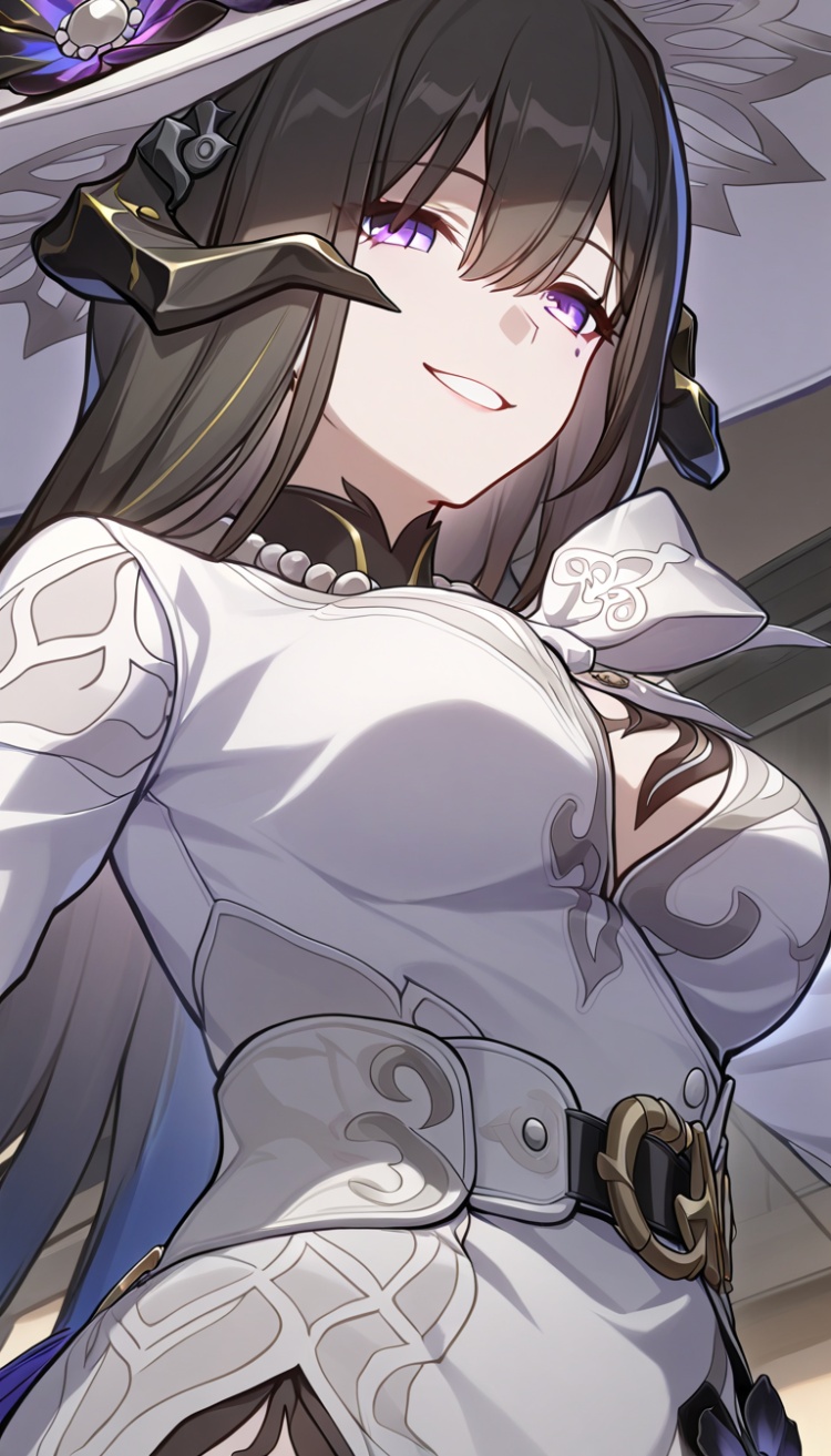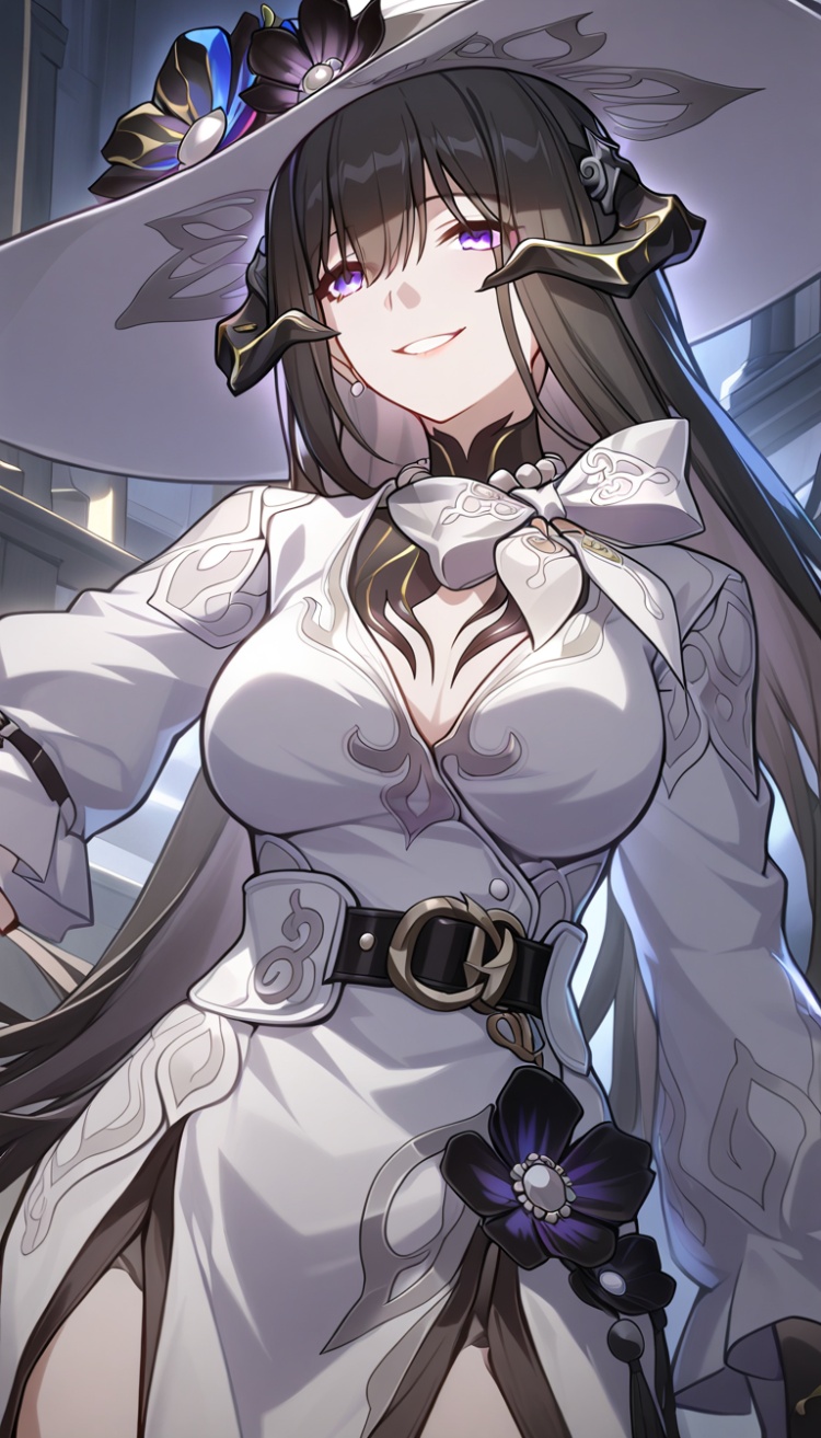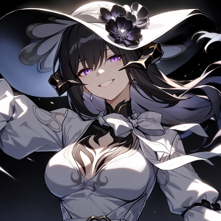 1girl, solo, Constance, hat, dress, upper body, smile, medium breasts, epic, dramatic, detailed light, masterpiece, best quality, very aesthetic,