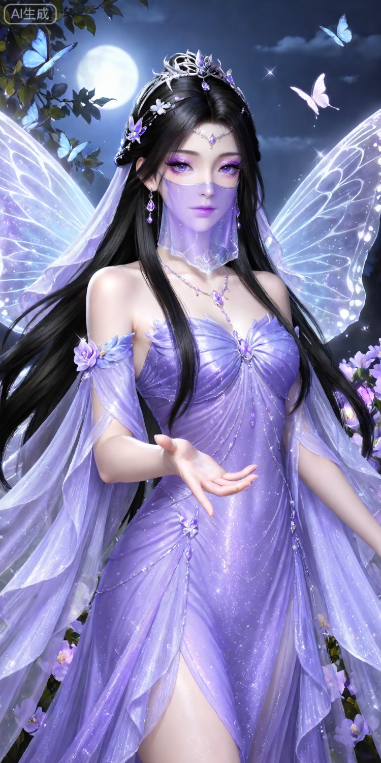 紫灵面部基础提示词:ziling,1girl,veil,solo,earrings,jewelry,black hair,white background,purple eyes,hair ornament,long hair,simple background,glitter,mouth veil,looking at viewer,closed mouth,makeup,eyeshadow,purple eyeshadow,