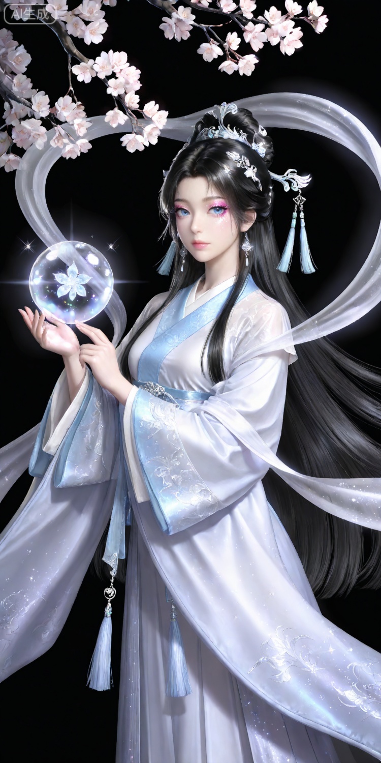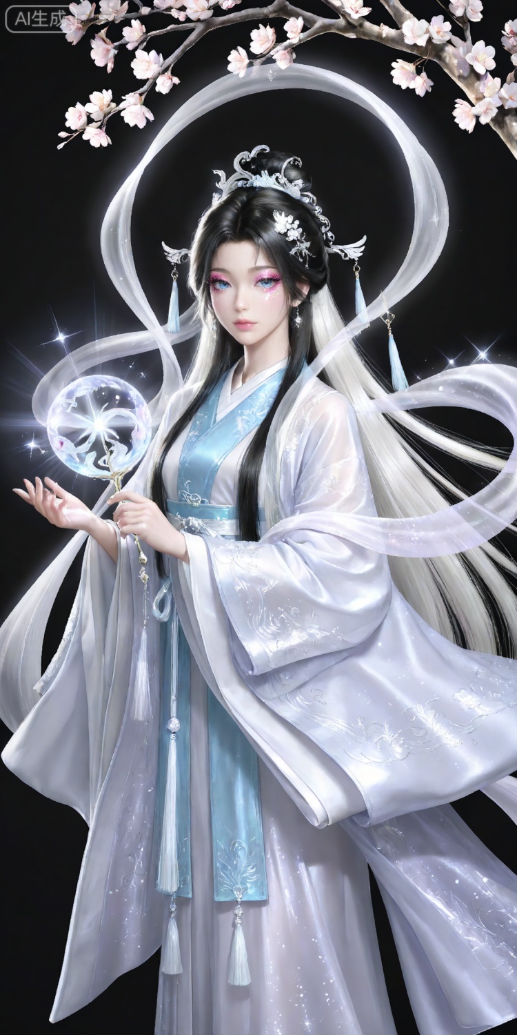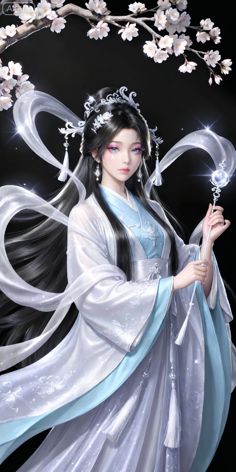 梅凝面部基础提示词:songyu,1girl,solo,blue eyes,black hair,long hair,white background,looking at viewer,makeup,eyelashes,realistic,eyeshadow,simple background,hair ornament,lips,closed mouth,mascara,glitter,eye glitter,