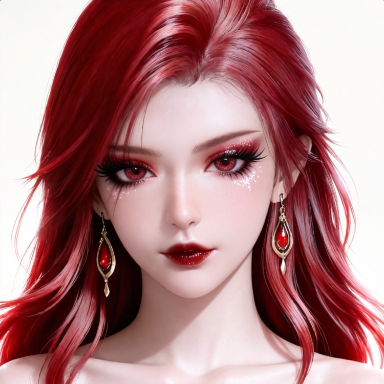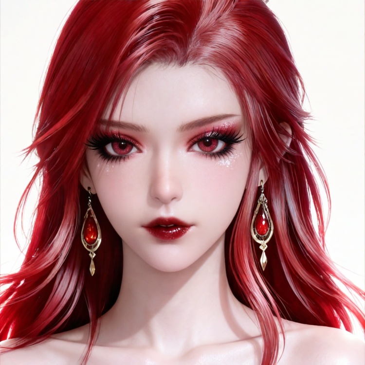 梅凝面部基础提示词:maxiaotao,1girl,solo,earrings,jewelry,red hair,looking at viewer,red lips,makeup,long hair,white background,red eyes,eyelashes,simple background,eyeshadow,collarbone,lipstick,bare shoulders,realistic,mascara,glitter,