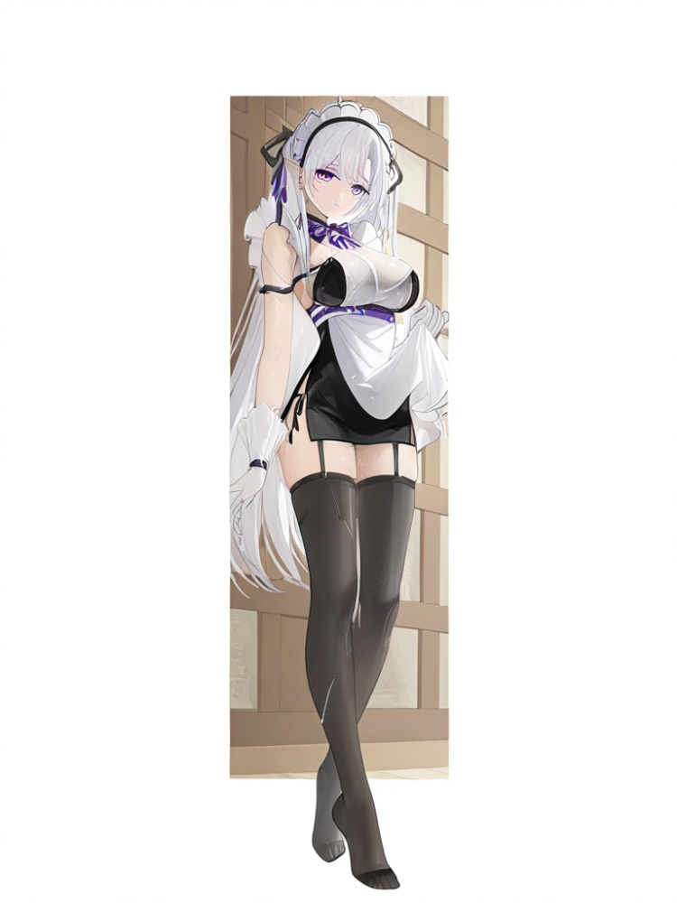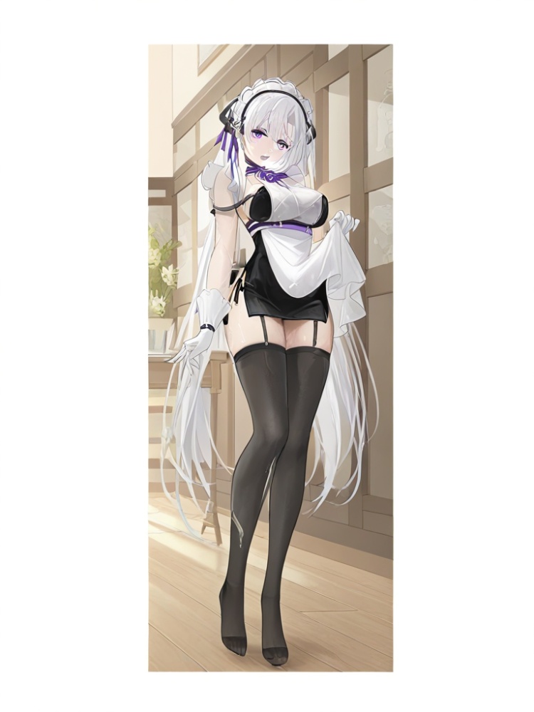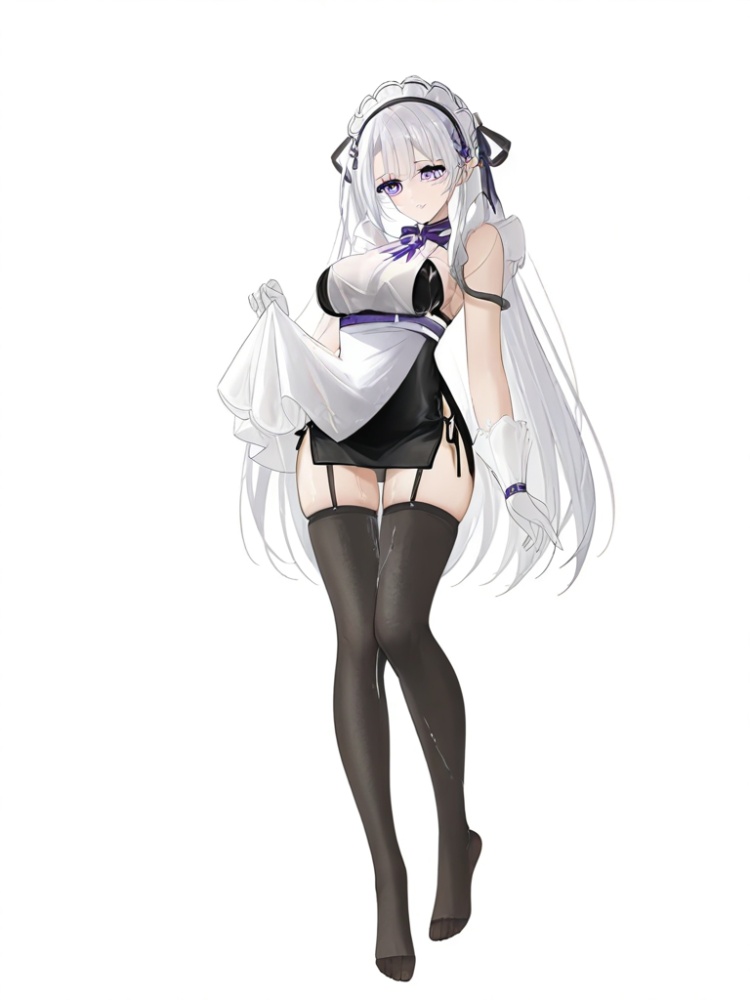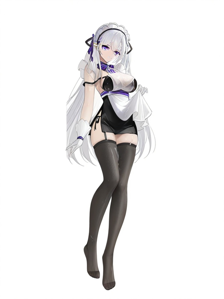 yinhe,solo,long hair,bangs,white hair,maid headdress,hair ribbon,purple ribbon,purple eyes,large breasts,choker,neckbell,white apron,black dres,short dress,garter straps,black thighhighs,tron thighhighs,bare foot,white gloves,1girl,