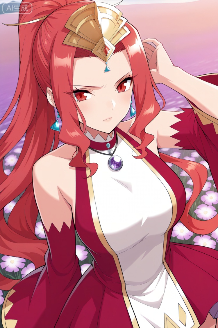 曹颖,masterpiece,best quality,official art,extremely detailed CG unity 8k wallpaper,1girl, solo, red eyes, sharp eyes, long hair, high ponytail, red hair, ahoge, hair ribbon, hair ornament, wavy hair, sidelocks, anime stylefantasy outfit, ornate dress, sleeveless dress, off shoulder, high collar, flared sleeves, asymmetrical skirt, short dress, wide sleeves, detached sleeves, red sleeves, ornate dress, gemstone necklace, tiara,forehead jewel, earrings, elegant, royal,