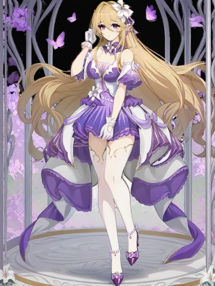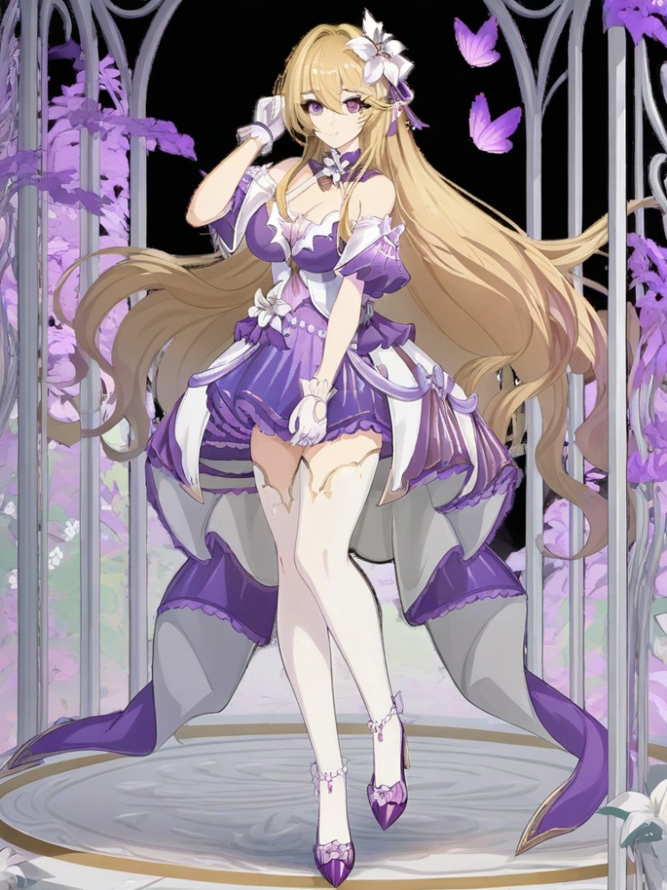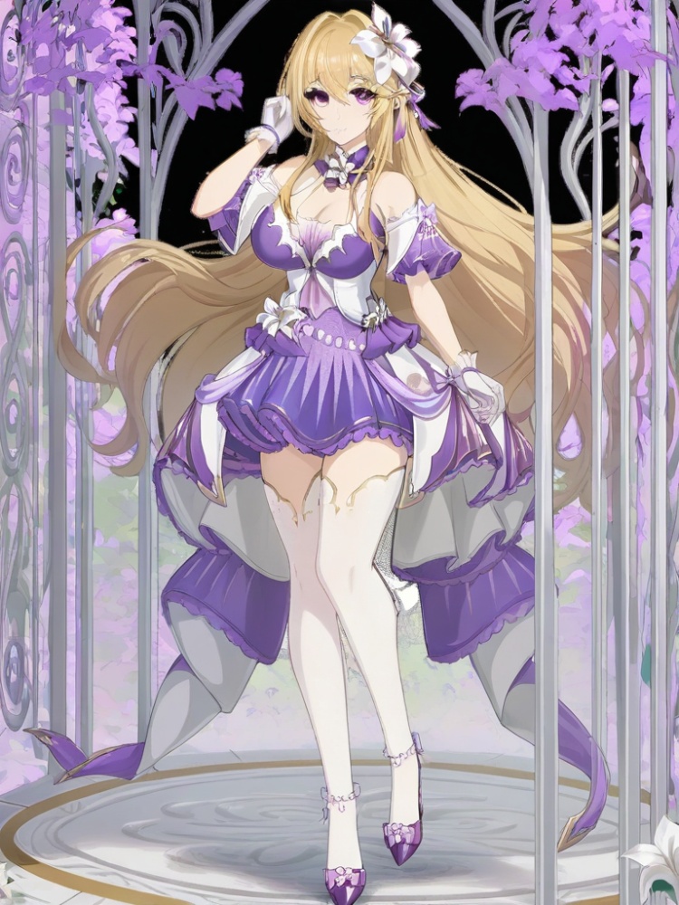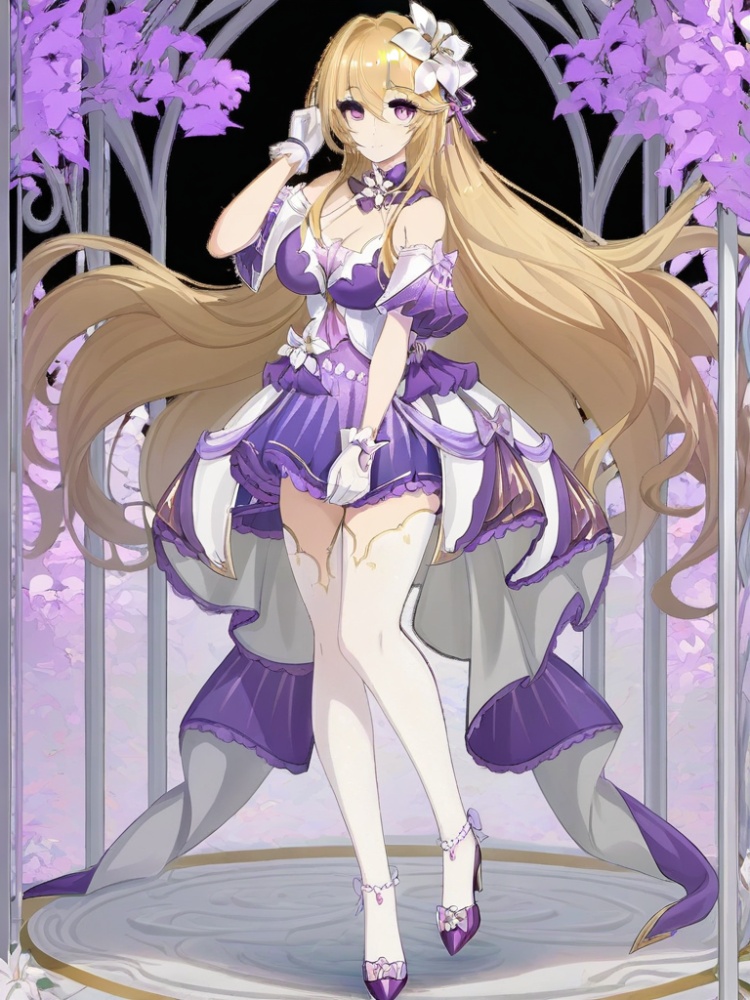 yinhe,solo,long hair,bangs,blonde hair,large breasts,hair ornament,thighhighs,gloves,dress,cleavage,hair between eyes,bare shoulders,very long hair,purple eyes,frills,white gloves,hair flower,high heels,white thighhighs,frilled dress,purple dress,purple footwear,pearl,hair ribbon,pointy ears,frilled ress,detached sleeves,short sleeves,high low dress,waist flower,1girl,
